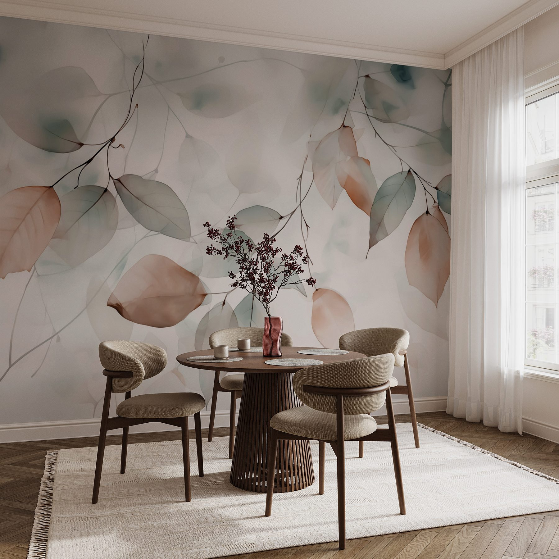 Proměňte svůj prostor pomocí “Jemných listů v jemných odstínech”. Tato okouzlující nástěnná malba je jako jemný šepot přírody, který vdechne život a klid do každé místnosti. Představte si měkké akvarelové listy, které kloužou po vašich stěnách a vytvářejí příjemnou atmosféru, která působí klidně a povznášejícím dojmem. Ať už se jedná o útulný čtecí koutek nebo světlou chodbu, tato nástěnná malba vás vybízí k zastavení a hlubokému nadechnutí, jako při procházce klidným lesem. Jemné odstíny lehce tančí, takže se nelze neusmát pokaždé, když procházíte kolem. Ať je tato nástěnná malba vaší každodenní připomínkou, že krásu lze nalézt i v těch nejjemnějších věcech!