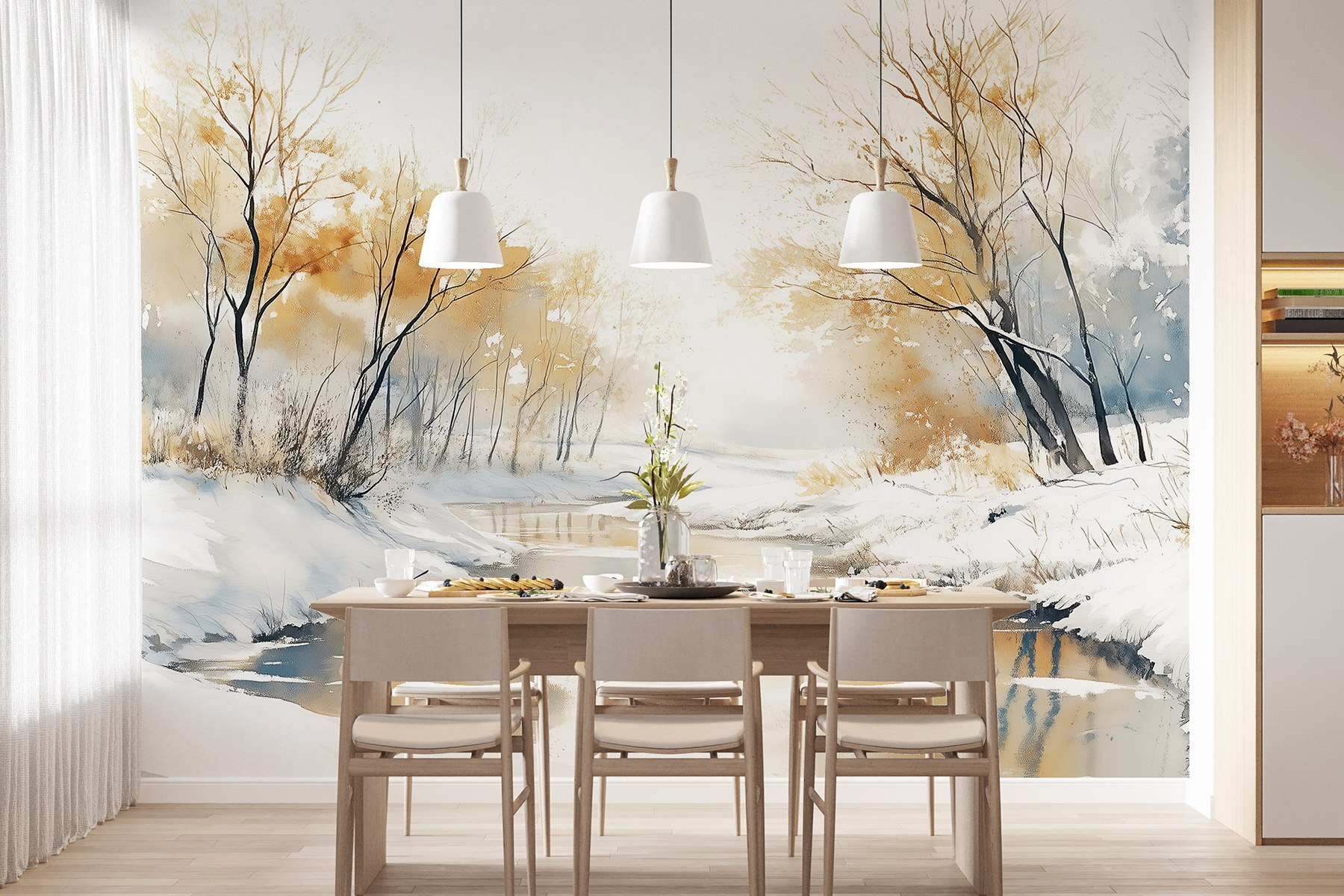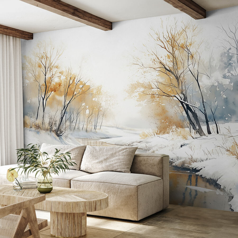 Představte si, že pokaždé, když vejdete do svého pokoje, vstoupíte do zasněžené říše divů. Tato nástěnná malba “Řeka se sněhem a stromy” zachycuje tuto klidnou atmosféru jako příjemná deka v chladném dni. Jemné akvarelové odstíny se jemně prolínají a vytvářejí poklidnou scénu řeky orámovanou křehkými stromy, to vše poprášené vrstvou sněhu.