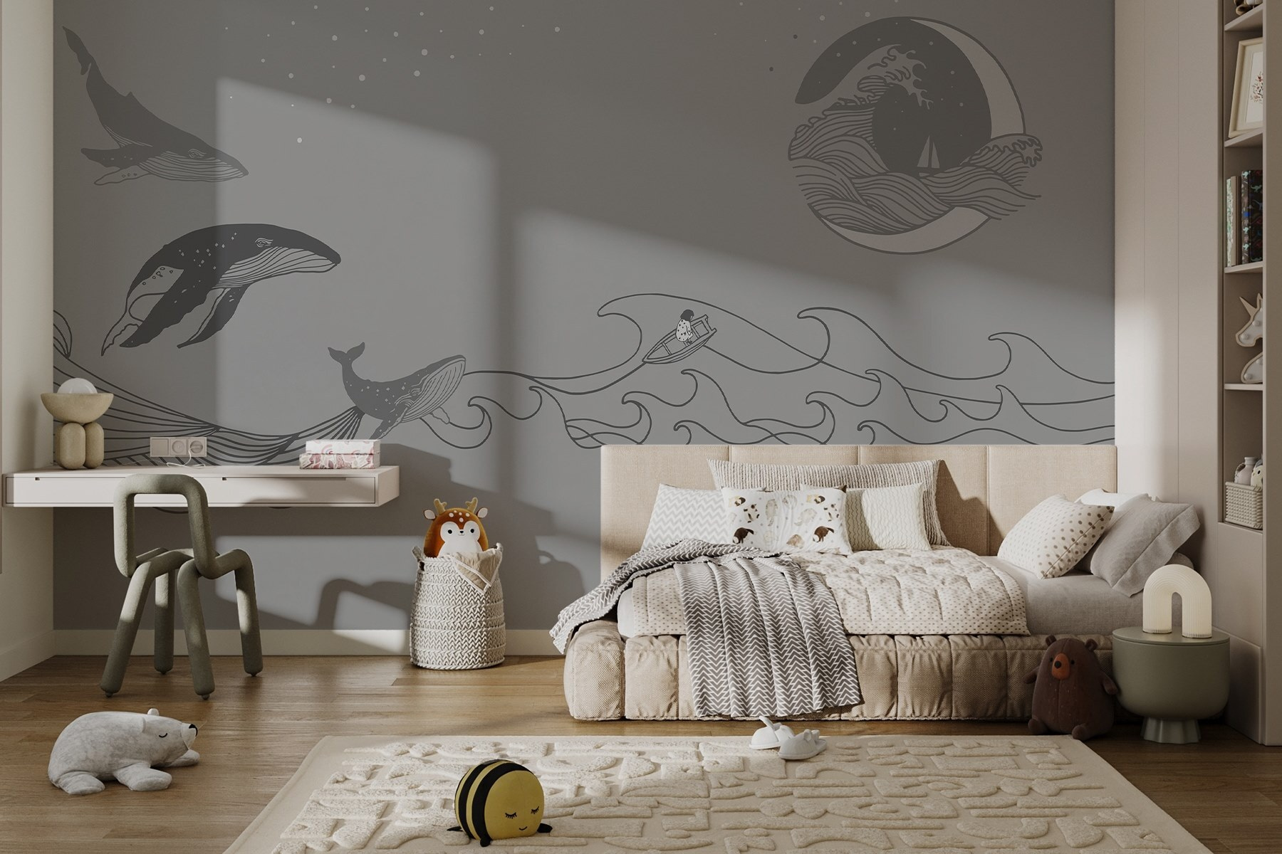 Tato nástěnná malba přináší uklidňující atmosféru, ideální do obývacích pokojů nebo útulných zákoutí. Představte si, jak popíjíte ranní kávu, kradmo se díváte na tyto něžné obry a cítíte, jak všechny starosti odplouvají – jako opalovací krém v horkém dni! Měkké barvy vybízejí k pocitu klidu, takže je to nádherná kulisa pro líná odpoledne nebo hluboké rozhovory. Je to víc než dekorace, je to zážitek, který čeká na své rozvinutí. Kdo ví, třeba vás inspiruje k několika vlastním námořním dobrodružstvím!
