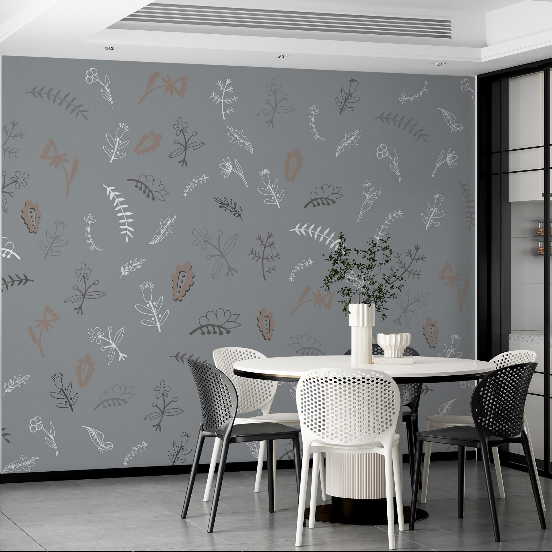 Proměňte každou místnost pomocí uklidňující atmosféry této “Nástěnné malby se vzorem květin a listů”. Je to jako vnést do interiéru dotek venkovní přírody – ale bez otravného hmyzu. Rozkošná směs jemných barev a složitých vzorů vytváří klidné pozadí, které působí svěže a živě, ale přesto útulně. Představte si lenošení v místnosti, ve které se budete cítit jako v klidné zahradě, a přitom popíjet svůj oblíbený nápoj. Ideální pro ty, kteří milují přírodu, ale nedokážou udržet pokojovou rostlinu při životě! Spojte ji s teplým osvětlením a voilà – máte kouzelné útočiště přímo u vás doma. Každý pohled na tyto okouzlující vzory vybízí k úsměvu, takže i den s prádlem bude o něco barevnější. Kdo by řekl, že dekorace na stěnu může být tak veselá?