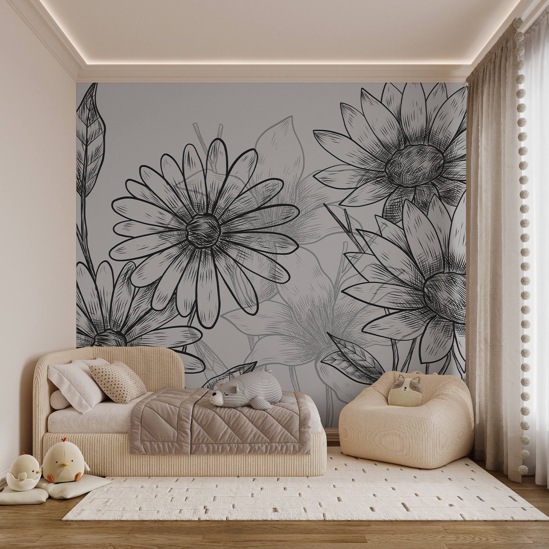 Proměňte každou místnost v rozkvetlý ráj s touto úžasnou nástěnnou malbou s nádhernou skupinou květin a listů. Představte si, že se každý den probouzíte s těmito krásnými květy, jejichž každý okvětní lístek je dokonale nakreslený. Je to jako mít miniaturní zahrádku přímo u vás doma, bez konve na zalévání!