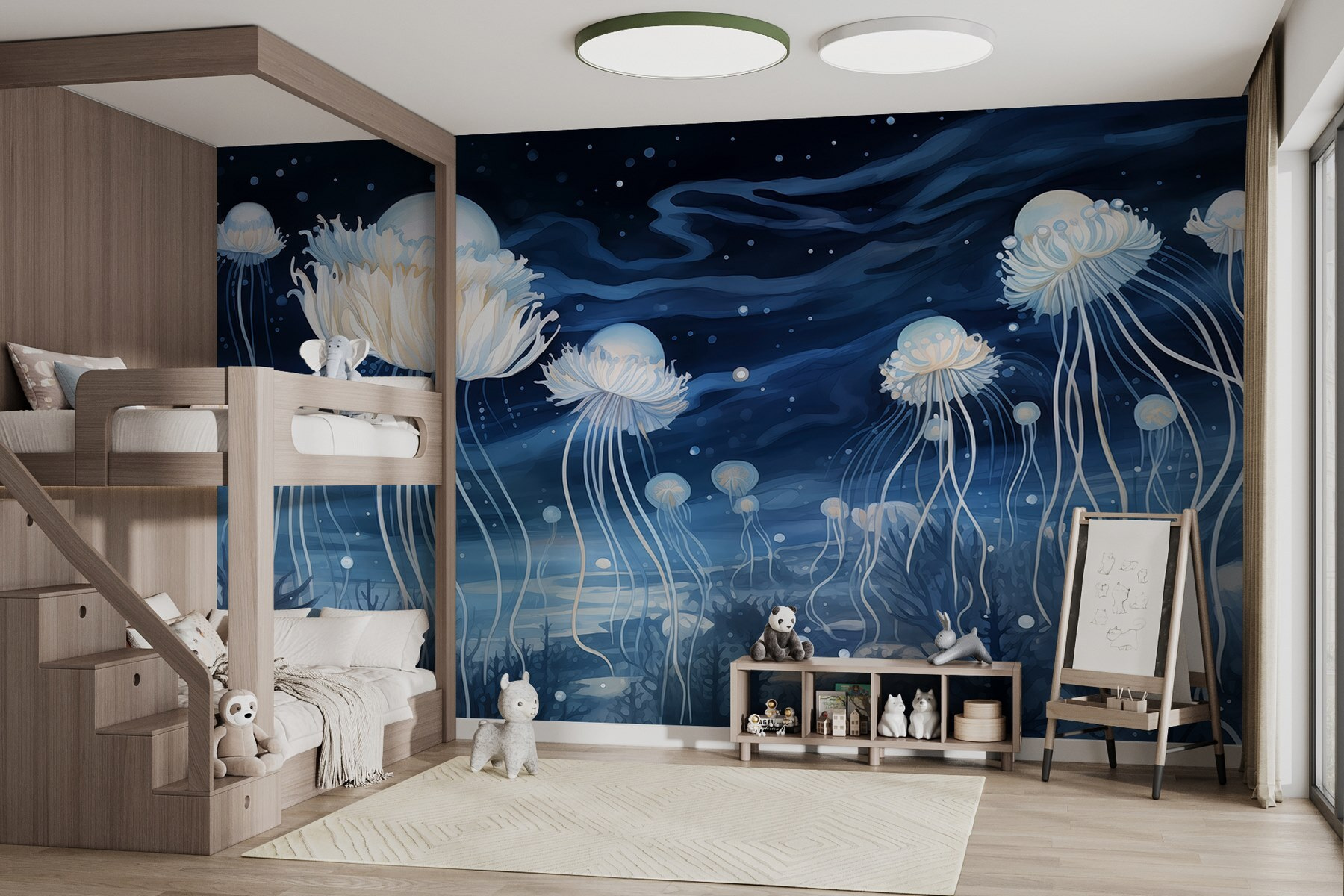 Proměňte jakýkoli prostor v uklidňující podmořskou snovou krajinu s touto úchvatnou nástěnnou malbou medúz klouzajících hvězdnou nocí. Představte si to: jakmile vstoupíte do místnosti, máte pocit, že se vznášíte v oceánu klidu, že? Jemné modré a bílé barvy medúz ladně tančí, zatímco na noční obloze se objevují drobné hvězdičky, které dodávají tu éterickou atmosféru. Ideální do obývacího pokoje nebo do útulného čtecího koutku – možná se přistihnete, jak se zasníte a ztratíte se v myšlenkách. Je to také podnět ke konverzaci! Přátelé se možná zeptají, jestli jste plavali s medúzami. Představte si jejich překvapení, když řeknete, že ne, že jste se místo toho jen tak poflakovali doma!