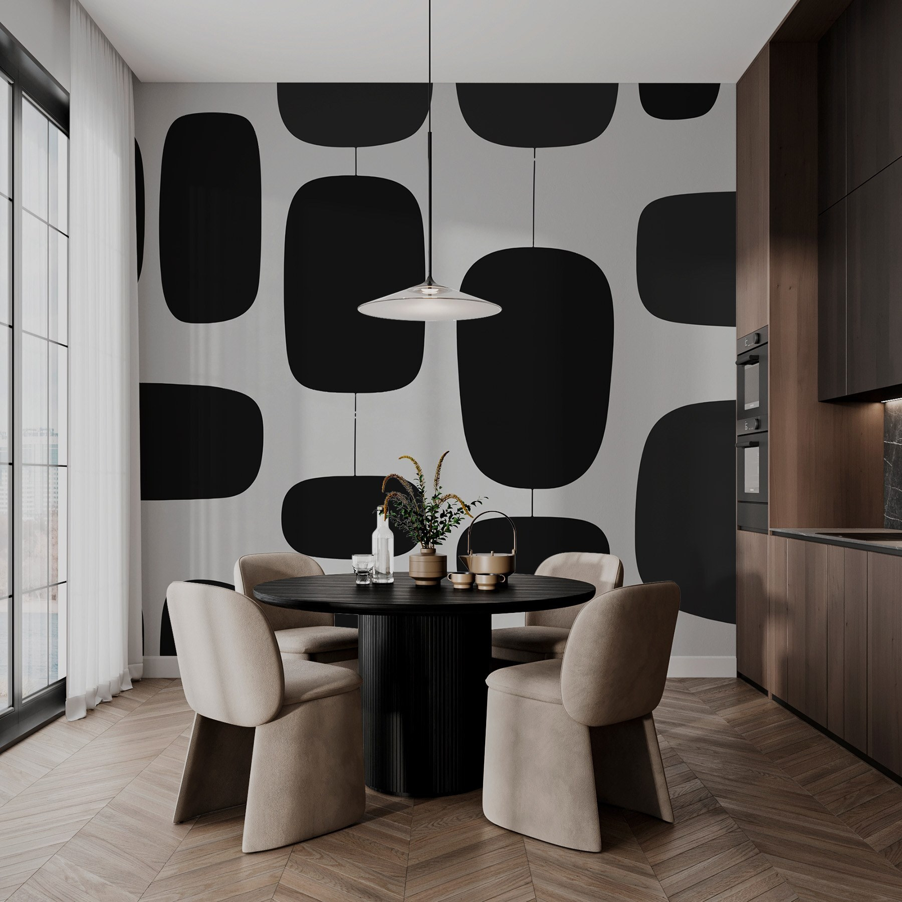 Proměňte svůj prostor pomocí této úžasné černobílé nástěnné malby – mluvte o výrazném kousku! Hravý vzor rozmanitých tvarů dodá vašemu interiéru moderní nádech a skvěle ho vylepší. Představte si, že vstoupíte do svého pokoje a pocítíte okamžitou změnu atmosféry. Je to jako umění, které vdechne vašim stěnám život.