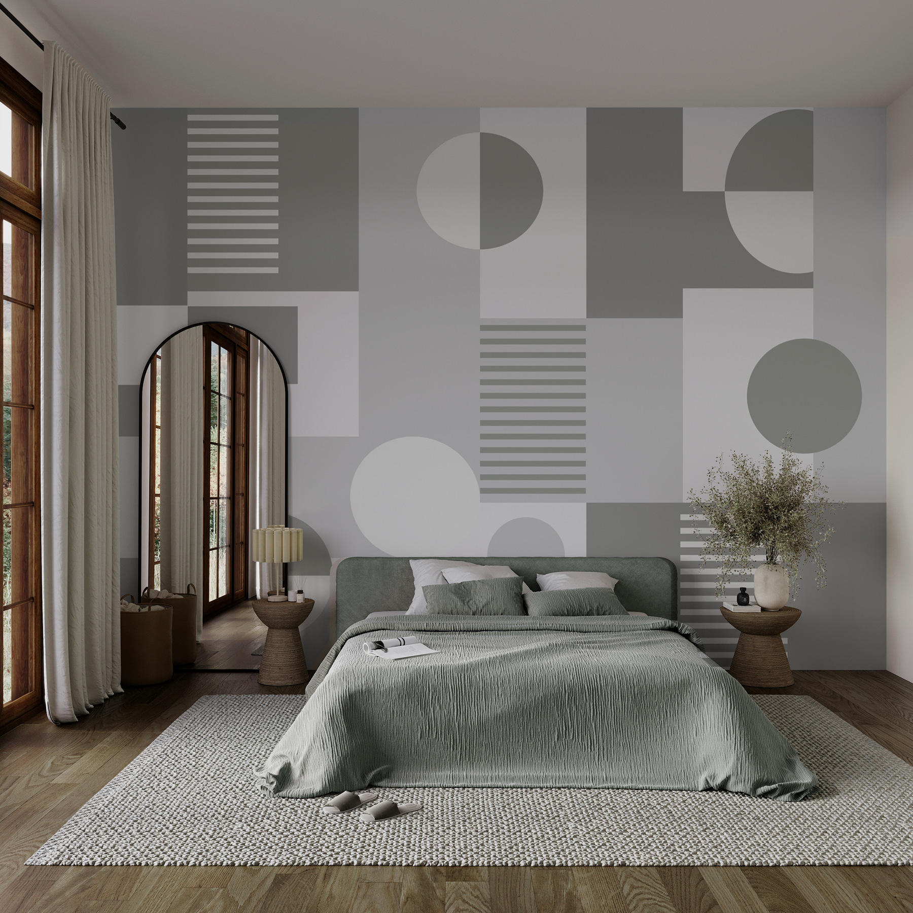 Hravá směs tvarů působí moderně, ale zároveň nadčasově a bez námahy vnáší nádech elegance. Je to jako dát svým stěnám útulný svetr – nic příliš křiklavého, jen tolik, abyste se usmívali pokaždé, když projdete kolem. Ať už se jedná o obývací pokoj nebo útulný koutek na čtení, tato nástěnná malba našeptává styl s jemným pošťouchnutím. Ideální pro ty, kteří oceňují jemnou krásu v každodennosti!