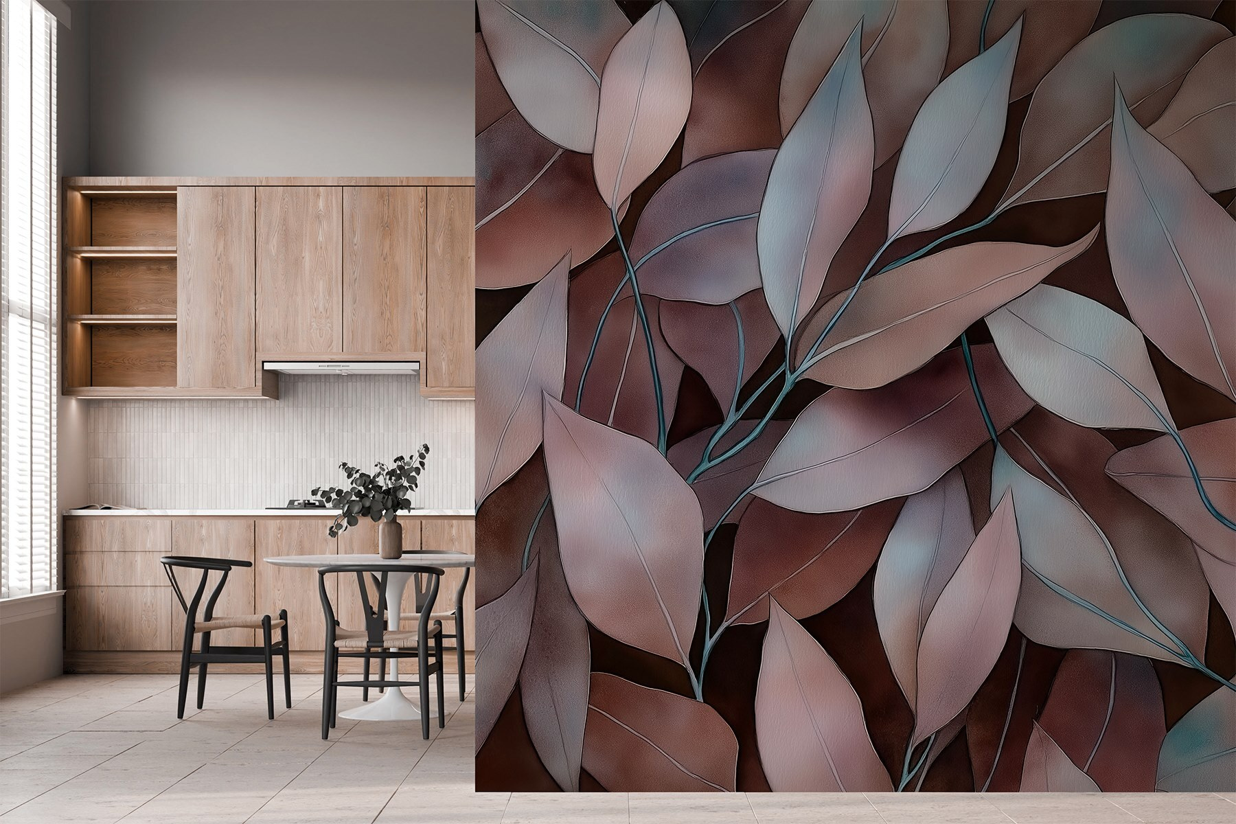 Ať už se nachází v obývacím pokoji nebo v klidném čtecím koutku, tato nástěnná malba vybízí k myšlenkám na líné odpoledne s popíjením čaje – možná až příliš čaje, pokud si člověk nedá pozor! Každý pohled může vyvolat radost a poskytnout klidný únik z každodenního shonu. Ideální pro ty, kteří touží po doteku přírody ve svém domově bez starostí se zaléváním rostlin. Kdo by řekl, že domácí dekorace může působit tak osvěžujícím dojmem?