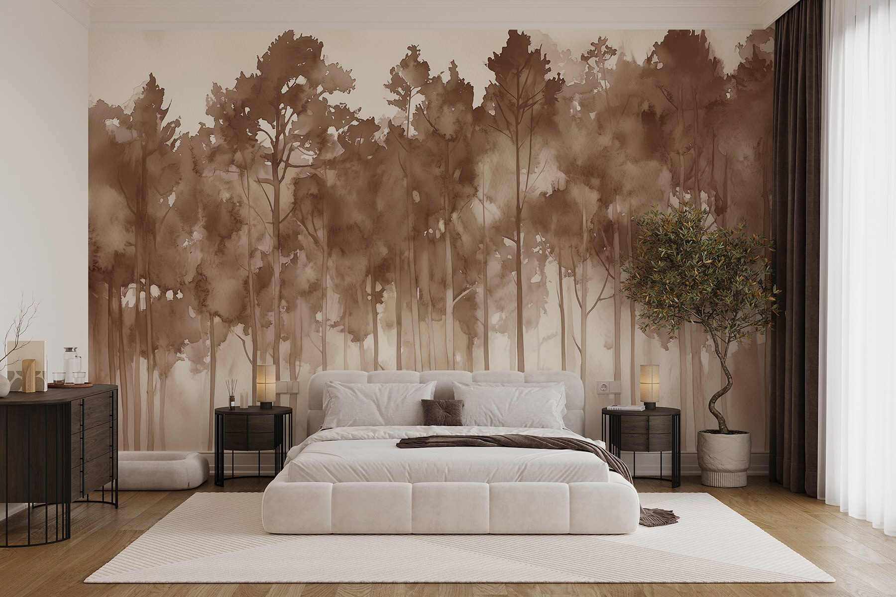 Proměňte stěnu v klidné útočiště pomocí této nástěnné malby “Skupina stromů v mlžném lese”. Představte si, že pokaždé, když vejdete do místnosti, vstoupíte do zasněné lesní krajiny. Jemné akvarelové odstíny vytvářejí uklidňující atmosféru, která jen našeptává klid. Je to jako způsob, jakým vás příroda zabalí do útulného objetí – bez otravných brouků!