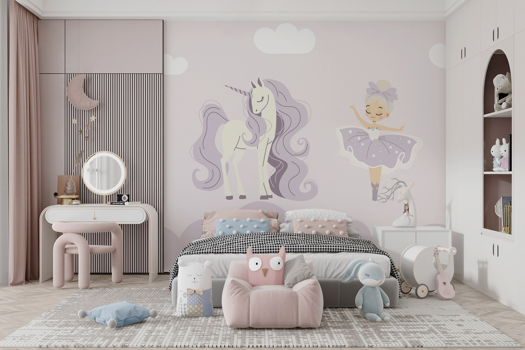 Proměňte jakýkoli prostor v rozmarnou říši divů s nástěnnou malbou “Jednorožec a baletka”. Představte si to: půvabný jednorožec a půvabná baletka tančící po zasněné pastelové obloze. Je to jako mít kousek kouzla přímo na zdi! Děti (a buďme upřímní, i dospělí) se mohou ztratit ve své fantazii a snít o víření a třpytu. Tato fototapeta se skvěle hodí do dětského pokoje nebo ložnice a i na té nejnudnější stěně se můžete cítit jako v pohádce. Jen si představte ty úsměvy, až se u vás zastaví kamarádi – každý miluje dobré pohádky o jednorožcích, že? Je jemná, okouzlující a tak inspirující – dokonalá kulisa pro dobrodružství a snění!