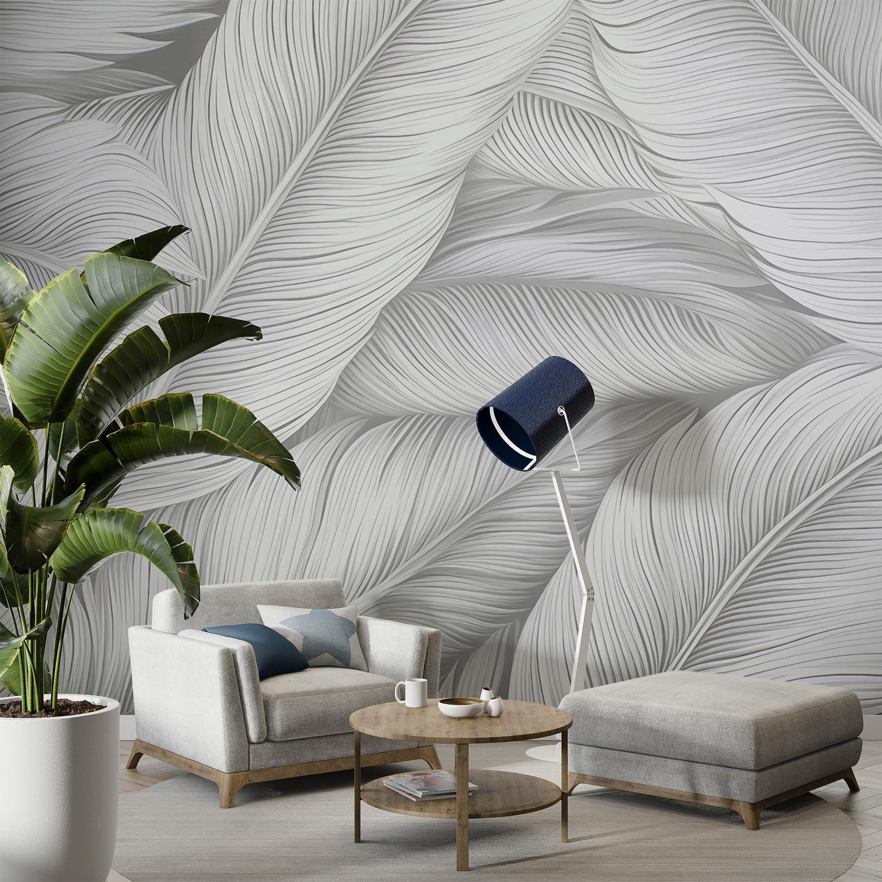 Vstupte do prostoru zahaleného do uklidňujících vibrací s touto nástěnnou malbou s měkkými vlajícími listy v jemných jednobarevných odstínech. Jako byste si do interiéru přinesli klidnou zahradu – bez otravných brouků a zalévání. Představte si, že pořádáte útulné setkání, kde všichni nenuceně obdivují elegantní stěnu a mají pocit, že narazili na elegantní, klidný úkryt. Jemné detaily nabízejí nádech uměřenosti, která vybízí k introspekci, ideální k popíjení čaje nebo snění. Ať už v obývacím pokoji nebo v klidném čtecím koutku, tato nástěnná malba promění stěny v závan čerstvého vzduchu. Váš pokoj si zaslouží trochu půvabu přírody, nemyslíte?