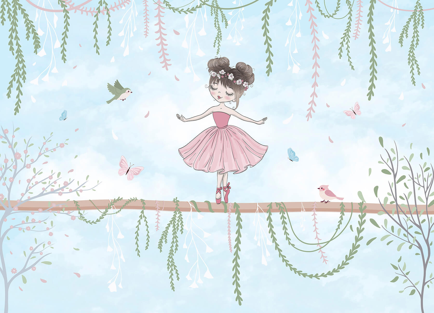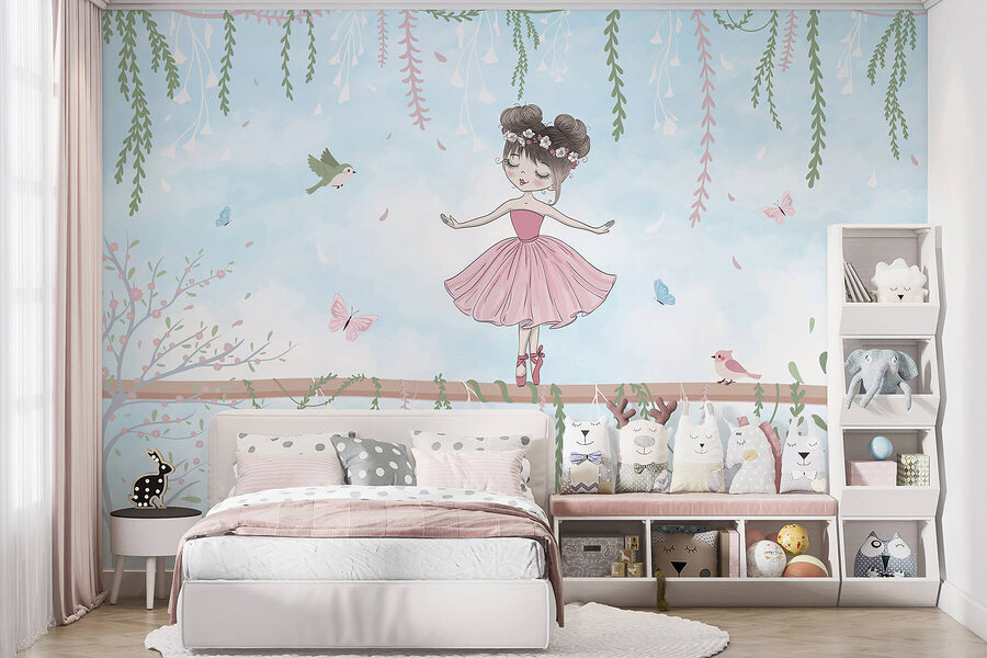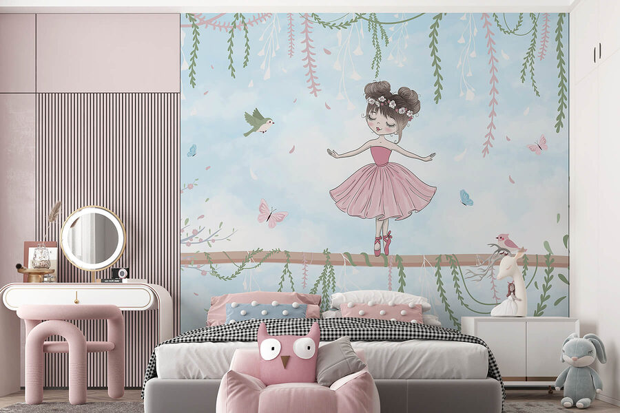 Vstupte do snového světa s touto okouzlující tapetou, na které je vyobrazena půvabná dívka v růžových šatech, dokonale vyvážená na větvi. Obklopená poletujícími motýly a hravými ptáčky, vypadá jako scéna přímo z kouzelné pohádky. Představte si, jak rozjasní útulný koutek na čtení nebo vykouzlí radost v dětském pokoji. Jemné barvy a fantaskní detaily vyvolávají úsměv a každý pohled je jako vřelé objetí. Představte si, jak popíjíte čaj, pozorujete její půvab a necháváte se unést příběhy, které inspiruje – kdo by to nechtěl? Tato tapeta není jen dekorací, je to kouzelný únik z reality!
