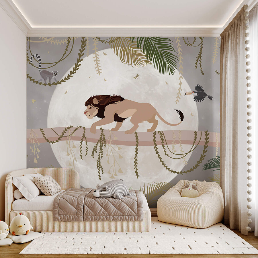 Představujeme vám nástěnnou malbu, která je plná divokého kouzla – seznamte se s „Lvem na větvi stromu“. Představte si tohoto majestátního tvora, jak sebevědomě kráčí po větvi, obklopený vlnícími se listy a snovým měsícem. Je to, jako byste si kousek tropů přinesli přímo do svého obývacího pokoje. Každý pohled přináší nádech dobrodružství, nemyslíte?