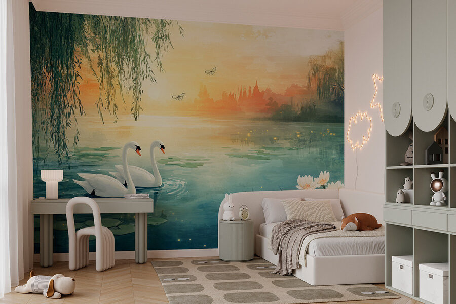 Ponořte se do klidu s nástěnnou malbou „Dvě labutě na jezeře“ – je to jako objetí samotné přírody! Tento design zobrazuje ladné labutě plující po klidném jezeře, zatímco mezi stromy prosvítá jemné sluneční světlo. Je ideální pro proměnu jakékoli místnosti v klidné útočiště. Představte si, jak popíjíte ranní kávu obklopeni touto jemnou scenérií nebo se zachumláte s dobrou knížkou, zatímco vás krásná atmosféra unáší daleko pryč. Jemné barvy a klidná atmosféra dodávají nádech elegance, díky čemuž se vše zdá o něco výjimečnější. A ty lekníny? Naprosto úchvatné! Tato tapeta není jen dekorací, je to pozvánka k zastavení, nadechnutí se a ocenění malých okamžiků. Nechte své stěny vyprávět příběhy klidu a krásy!
