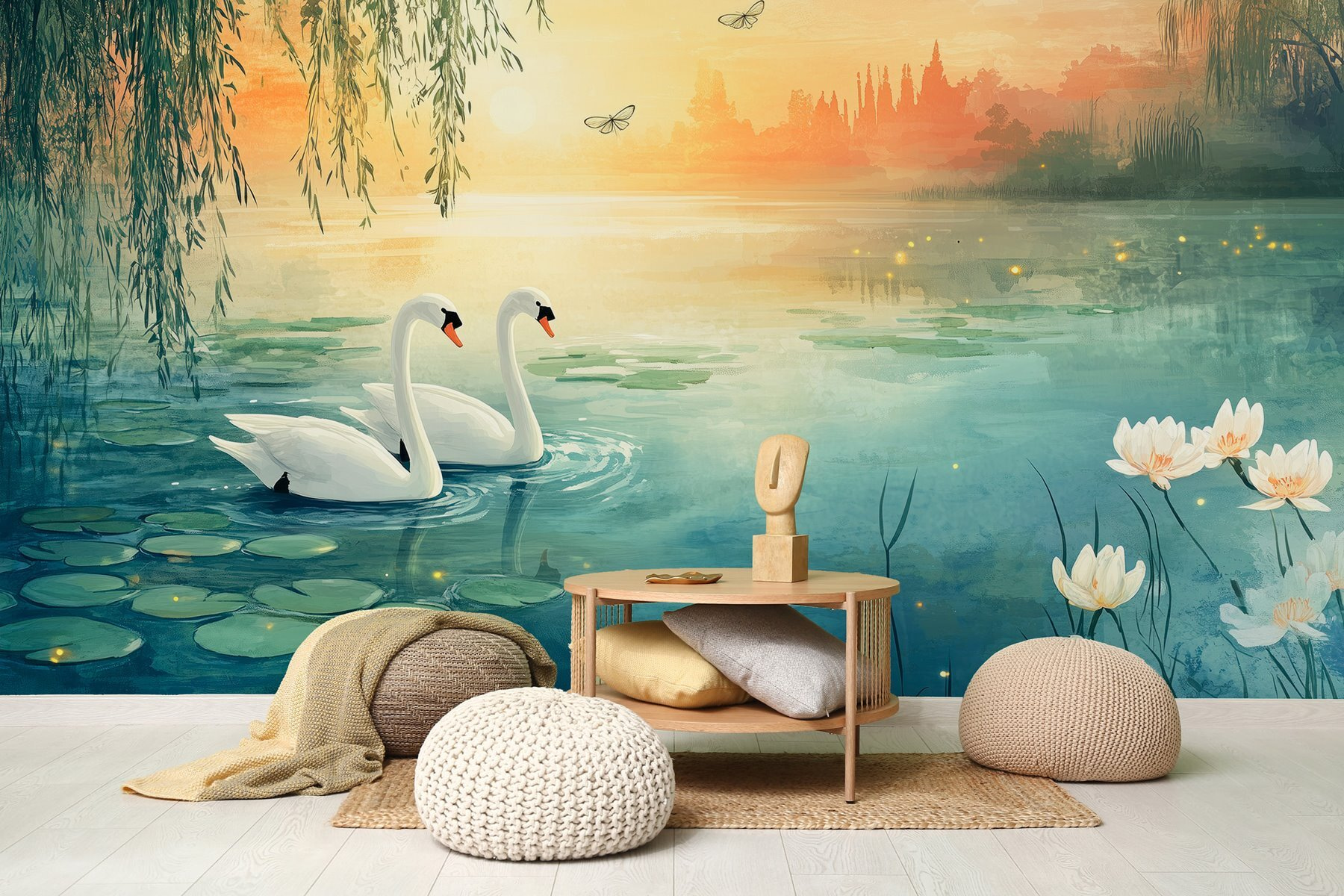 Ponořte se do klidu s nástěnnou malbou „Dvě labutě na jezeře“ – je to jako objetí samotné přírody! Tento design zobrazuje ladné labutě plující po klidném jezeře, zatímco mezi stromy prosvítá jemné sluneční světlo. Je ideální pro proměnu jakékoli místnosti v klidné útočiště. Představte si, jak popíjíte ranní kávu obklopeni touto jemnou scenérií nebo se zachumláte s dobrou knížkou, zatímco vás krásná atmosféra unáší daleko pryč. Jemné barvy a klidná atmosféra dodávají nádech elegance, díky čemuž se vše zdá o něco výjimečnější. A ty lekníny? Naprosto úchvatné! Tato tapeta není jen dekorací, je to pozvánka k zastavení, nadechnutí se a ocenění malých okamžiků. Nechte své stěny vyprávět příběhy klidu a krásy!
