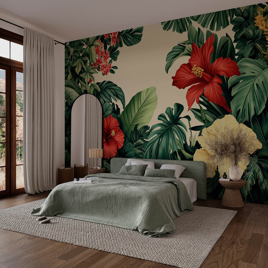 Proměňte jakýkoli pokoj v tropické útočiště díky této úchvatné nástěnné malbě, která zobrazuje zářivou skupinu květin a svěží listí. Představte si, že vstoupíte do svého pokoje a přivítají vás výrazné květy ibišku a sytě zelené barvy. Je to jako malá dovolená přímo u vás doma! Tato tapeta nejen dodává barvu, ale také živého ducha, který je ideální pro rozjasnění vašeho obývacího pokoje nebo pro vnesení doteku přírody do útulného koutku na čtení. Představte si, jak popíjíte drink a kocháte se touto botanickou krásou – čistá blaženost! Ideální pro každého, kdo touží po špetce venkovského kouzla, aniž by musel cokoli zalévat.