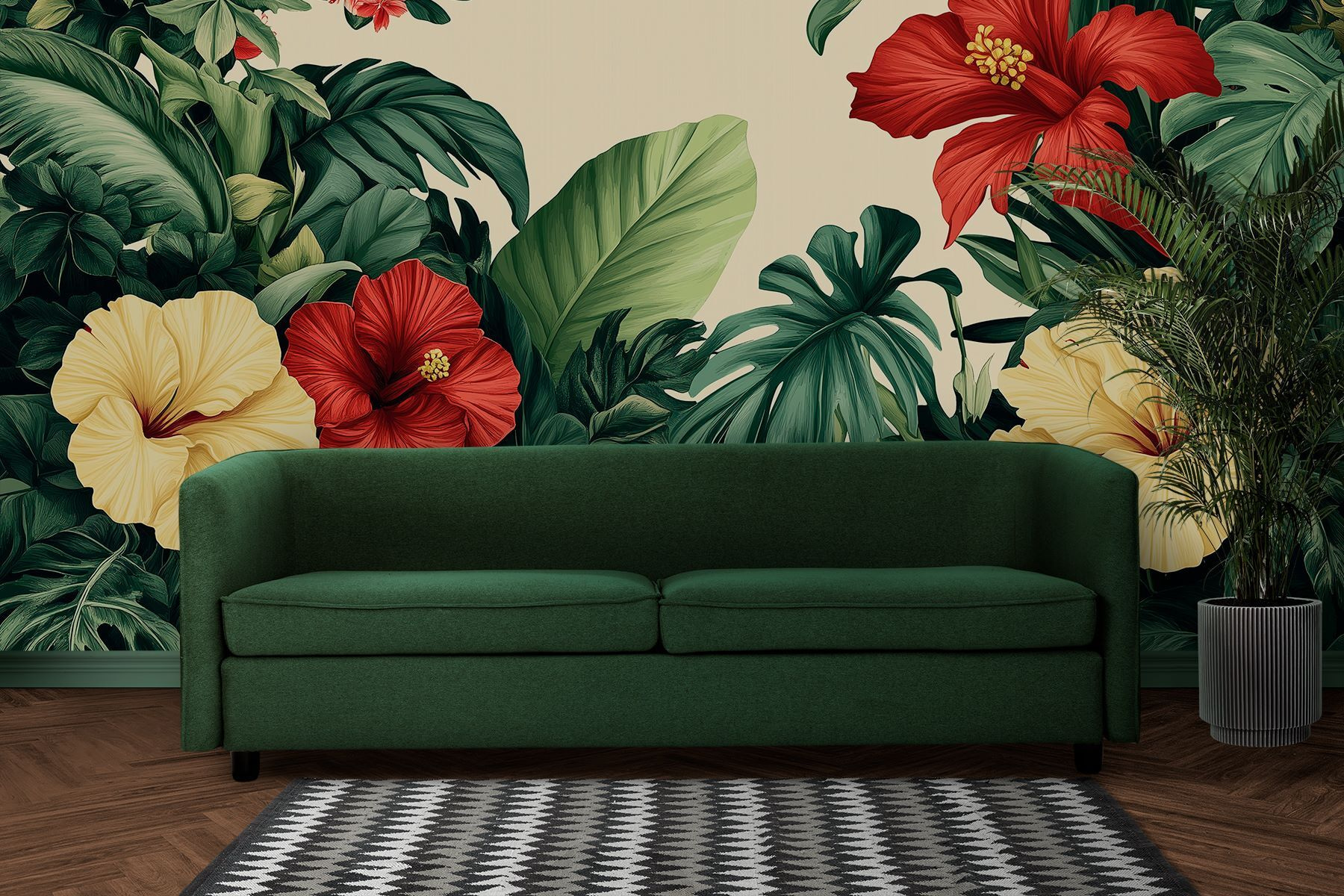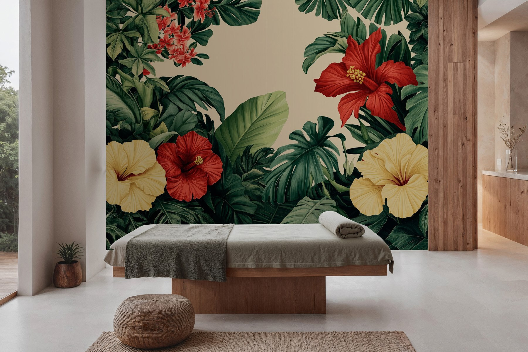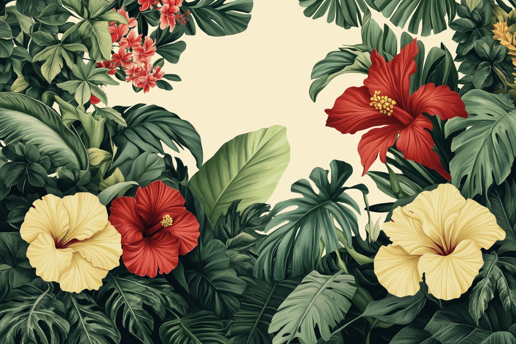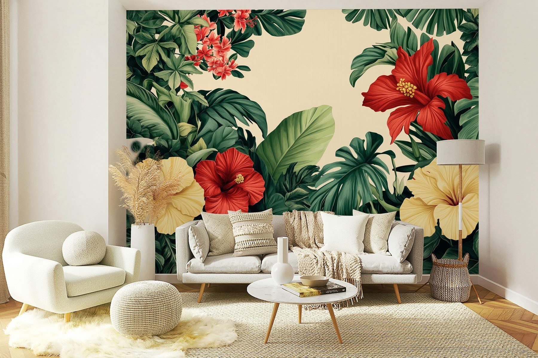 Proměňte jakýkoli pokoj v tropické útočiště díky této úchvatné nástěnné malbě, která zobrazuje zářivou skupinu květin a svěží listí. Představte si, že vstoupíte do svého pokoje a přivítají vás výrazné květy ibišku a sytě zelené barvy. Je to jako malá dovolená přímo u vás doma! Tato tapeta nejen dodává barvu, ale také živého ducha, který je ideální pro rozjasnění vašeho obývacího pokoje nebo pro vnesení doteku přírody do útulného koutku na čtení. Představte si, jak popíjíte drink a kocháte se touto botanickou krásou – čistá blaženost! Ideální pro každého, kdo touží po špetce venkovského kouzla, aniž by musel cokoli zalévat.