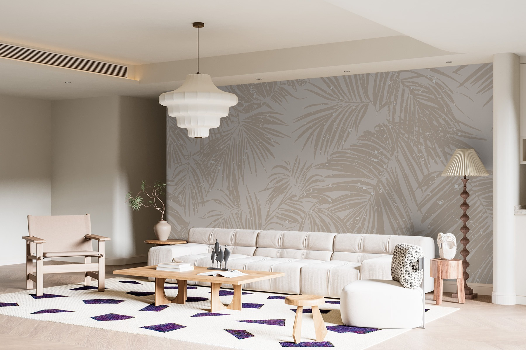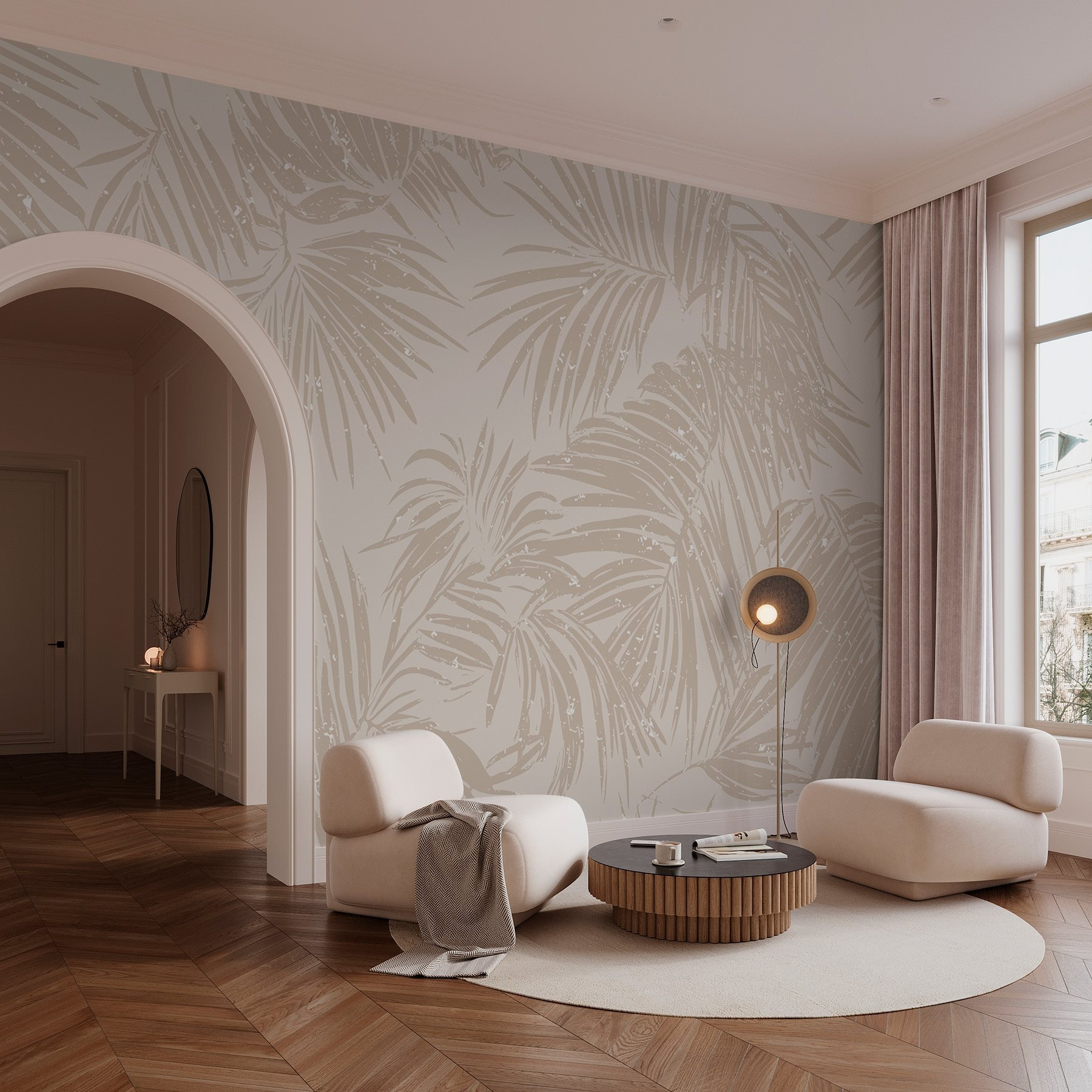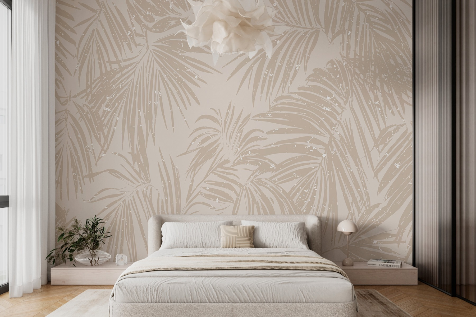 Představte si, že vstoupíte do klidné oázy přímo ve svém obývacím pokoji. Tato nástěnná malba s jemnými vzory palmovými listy na měkkém neutrálním pozadí navozuje klidnou atmosféru a dotek tropického kouzla. Představte si, že hostíte přátele a místo obvyklého povídání je upoutá vaše nádherná tapeta – „Kde jste ji sehnali?“ Je to dokonalá kombinace elegance a uvolněné atmosféry, která z ní dělá skvělé pozadí pro útulné večery nebo slunečné brunche. Světlo se od listů odráží přesně tak, jak má, a vytváří klidnou atmosféru. Je to jako mít mini dovolenou doma, bez letenek a opalovacího krému! Ideální pro milovníky přírody nebo pro kohokoli, kdo chce uniknout každodenní rutině, aniž by musel opustit domov. Věřte, že tento obraz zkrášlí váš prostor tak, že se všichni budou cítit o něco uvolněněji.