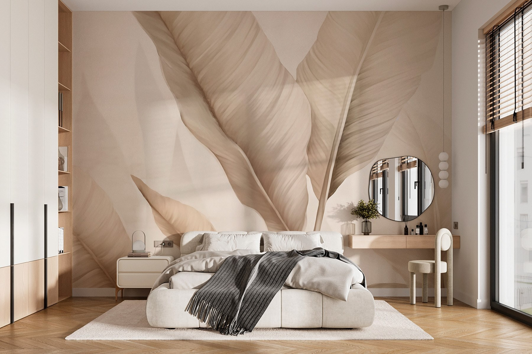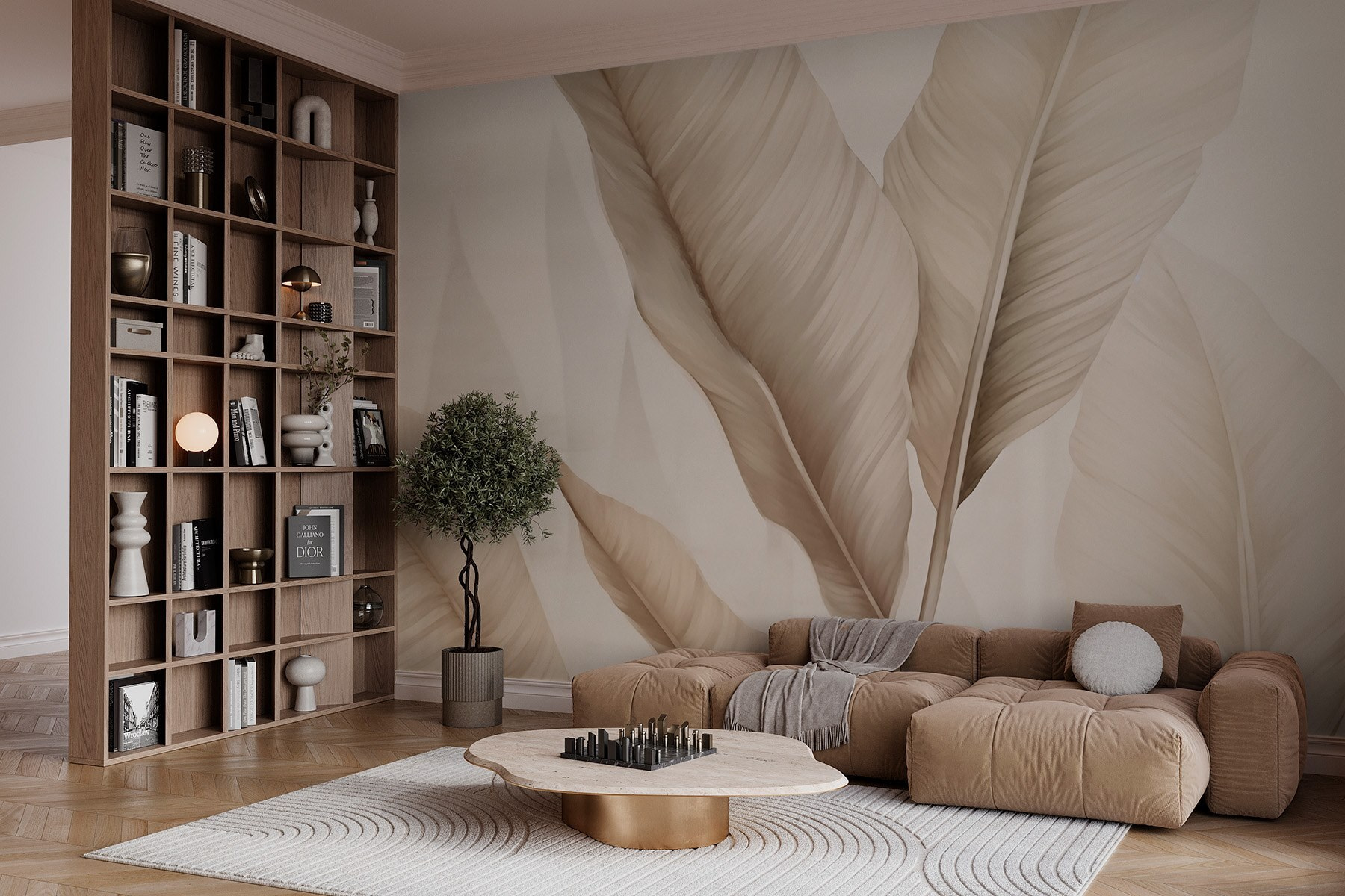 Transform any room into a tranquil oasis with this lovely mural featuring delicate leaves dancing on a soft background. It’s like bringing a little slice of nature indoors—perfect for those who’d love a tropical escape without leaving the sofa. Imagine sipping your morning coffee while subtly surrounded by these calming tones. It’s easy on the eyes, too—no neon colors here, just soothing shades that tell your walls, “Hey, let’s chill out.” Whether it’s a cozy reading nook or a lively living room, this mural whispers peace while making a stylish statement. Plus, it adds that perfect touch of sophistication. Who doesn’t love a little elegance with their indoor greenery?