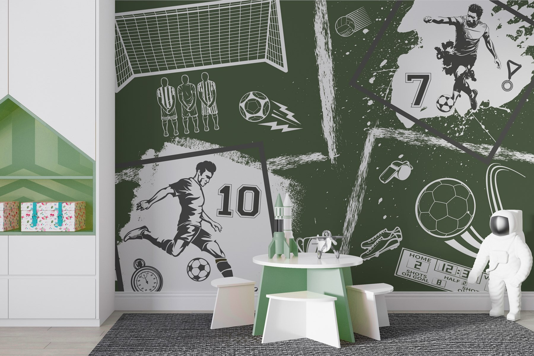 Proměňte svůj prostor pomocí této živé nástěnné malby „Koláž různých sportovních obrázků“. Je to jako mít vzrušení ze hry přímo ve svém obývacím pokoji! Představte si to: přátelé se sešli, oči upřené na detaily fotbalové akce, boty, trofeje a – oh, je to píšťalka rozhodčího? Každý prvek vypráví příběh o týmové práci, vášni a těch napínavých momentech, kdy se míč chystá zasáhnout síť. Tato tapeta je ideální pro sportovní nadšence nebo kohokoli, kdo ocení pořádnou dávku energie, a přináší veškeré vzrušení bez nutnosti rozhodčího. Rozlučte se s nudnými stěnami – je čas oživit svůj interiér!