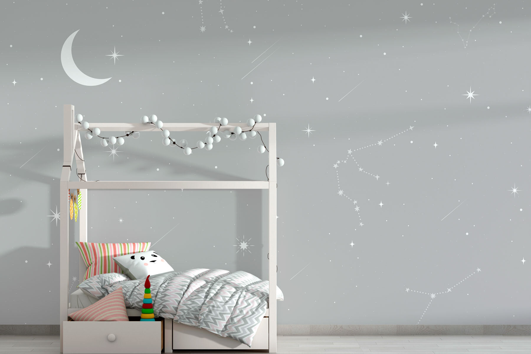 Proměňte obyčejný pokoj ve snový únik s nástěnnou malbou Šedá obloha s hvězdami a měsícem. Představte si, že vstoupíte do svého prostoru a přivítá vás klidná noční obloha s třpytivými hvězdami a něžným měsícem. Je to jako pozvat do interiéru trochu magie. Ideální pro útulné večery strávené popíjením čaje nebo nočním povídáním pod hvězdami – bez chladného vzduchu. Navíc, kdo by nemiloval ten pocit, když se při lenošení na gauči dívá na souhvězdí? Pozvedněte svůj interiér bez námahy a užijte si dotek vesmíru přímo u vás doma!