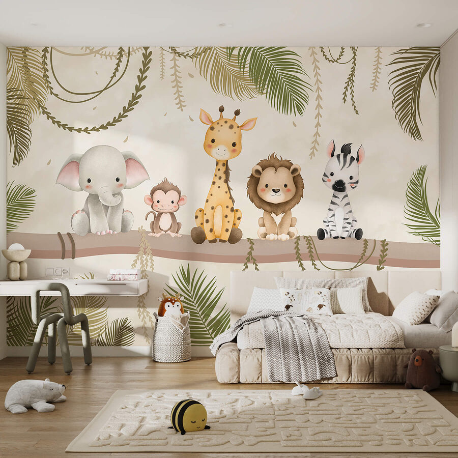 Proměňte svůj prostor v živou džungli s touto nádhernou nástěnnou malbou s rozkošnou partou zvířecích kamarádů sedících na robustní větvi. Představte si to: drzá opice, něžný slon, okouzlující žirafa, přátelský lev a hravá zebra, všichni připraveni přinést na vaše stěny radost a teplo. Je to jako mít mini safari přímo u vás doma. Tato nástěnná malba, která se skvěle hodí do dětského pokoje nebo útulného koutku, vybízí k úsměvu a podněcuje fantazii. Kdo by nechtěl přijít domů k partě přátelských tváří? Ideální pro děti všech věkových kategorií nebo prostě pro každého, kdo má velké srdce pro zvířata!