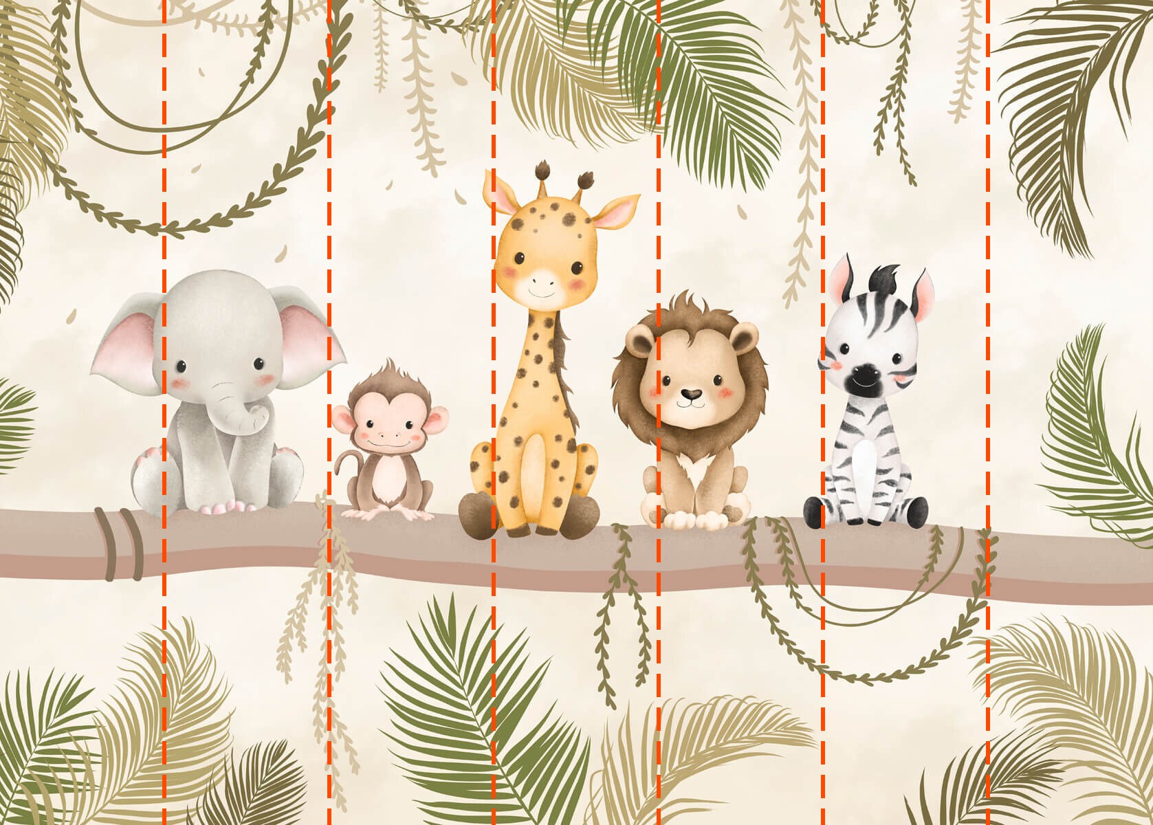 Proměňte svůj prostor v živou džungli s touto nádhernou nástěnnou malbou s rozkošnou partou zvířecích kamarádů sedících na robustní větvi. Představte si to: drzá opice, něžný slon, okouzlující žirafa, přátelský lev a hravá zebra, všichni připraveni přinést na vaše stěny radost a teplo. Je to jako mít mini safari přímo u vás doma. Tato nástěnná malba, která se skvěle hodí do dětského pokoje nebo útulného koutku, vybízí k úsměvu a podněcuje fantazii. Kdo by nechtěl přijít domů k partě přátelských tváří? Ideální pro děti všech věkových kategorií nebo prostě pro každého, kdo má velké srdce pro zvířata!