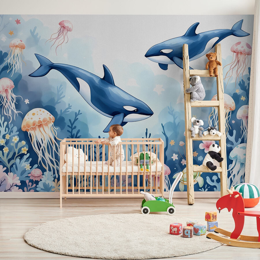 Proměňte svůj prostor v podmořskou říši divů s touto okouzlující nástěnnou malbou, na které jsou vyobrazeny velryby a hravá želva dovádějící v živých vodách oceánu. Představte si, že vstupujete do místnosti, kde se líně vznášejí medúzy a barevné korály se vlní, jako by tančily. Je to, jako byste měli kousek moře přímo u sebe doma! Tato tapeta, která se perfektně hodí k pobřežní atmosféře, vás přenese do snů o dnech strávených na pláži a mořském vánku. Kdo by se neusmál při pohledu na želvy, které si klidně plavou v moři? Toto umělecké dílo není jen dekorací, je to pozvánka k úniku a objevování – bez potápěčského vybavení!