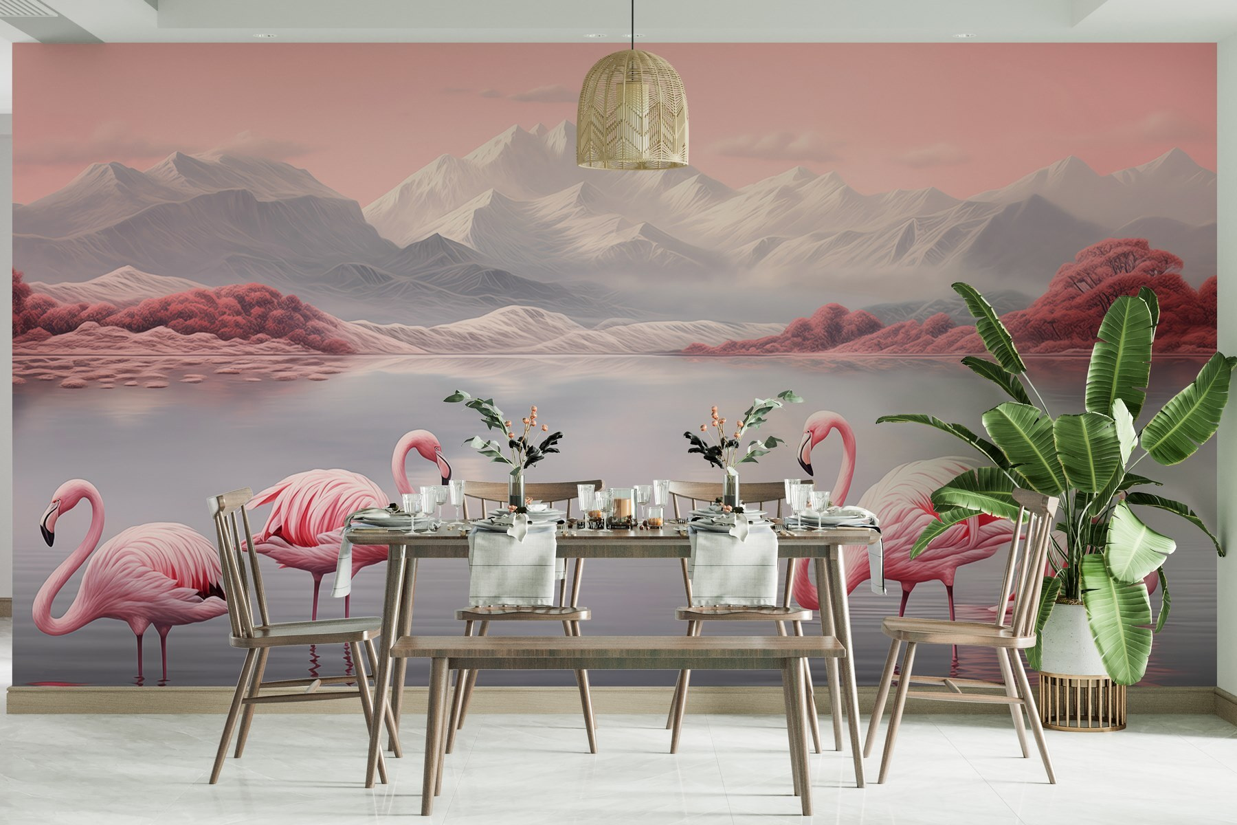 Bring a slice of paradise into your home with this stunning mural featuring two elegant flamingos standing gracefully in tranquil waters. The soft pastel colors and dreamy landscape whisk you away to a tropical retreat without ever leaving your living room. Imagine sipping your morning coffee while gazing at this serene scene—it’s like a little holiday for your wall! Perfect for those who believe in the calming power of nature, this mural turns any space into a mini oasis. Plus, who wouldn’t want flamingos showing off their style in their home? They might even inspire some cheerful dance moves—just saying! It’s less about perfection and more about that vibe that makes you smile.