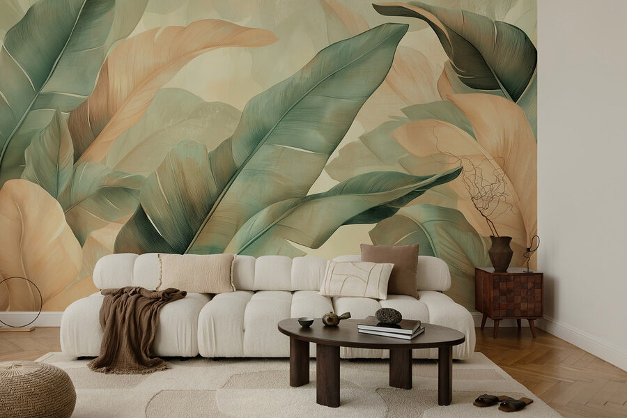 Proměňte svůj prostor pomocí živé nástěnné malby “Svěží listy v jemných barvách”. Představte si, že pokaždé, když vejdete do místnosti, vstoupíte do tropické oázy – tato sytá listnatá zeleň dokáže pozvat do přírody. Jemné broskvové tóny prosvítají a dodávají každému koutu ten správný nádech tepla. Je to jako pověsit si na zeď kus přírody, aniž byste se museli starat o zalévání rostlin. Skvěle oživí útulný obývací pokoj nebo oživí čtecí koutek. Představte si, jak popíjíte svůj oblíbený nápoj obklopeni touto svěží atmosférou nebo hostíte přátele, kteří nemohou neobdivovat tu krásu. Je to víc než dekorace, je to zážitek, který může dokonce inspirovat snění o vzdálených místech.