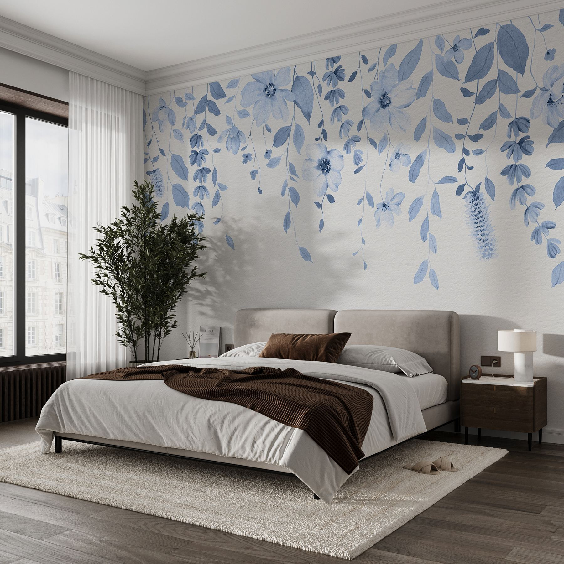 Proměňte jakýkoli prostor díky klidnému kouzlu nástěnné malby “Modré květy a listy”. Představte si to: jemná, kaskádovitá přehlídka jemných květů a listů, kde odstíny modré spolu tančí jako chladný vánek za slunečného dne. Jako byste si přinesli nádech přírody přímo do svého pokoje, aniž byste se museli starat o zalévání!