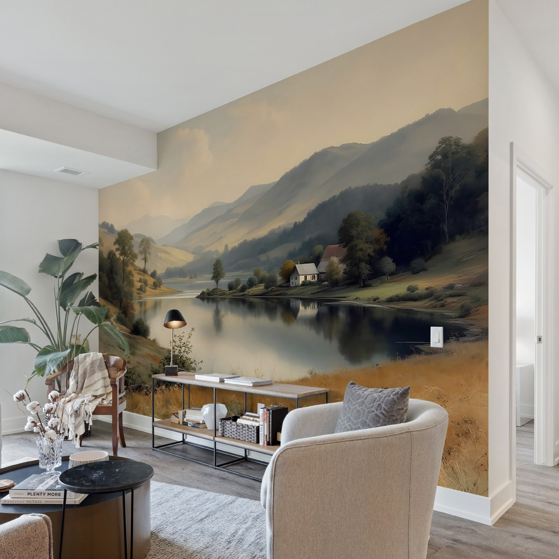 Proměňte nudnou stěnu v klidné útočiště pomocí této úžasné nástěnné malby s klidným jezerem, půvabným domem a jemnými stromy. Představte si, jak popíjíte kávu, uvelebeni na gauči a nasáváte klidné vibrace. Jemné odstíny šeptají “relax”, když zvou do vašeho prostoru klid. Představte si nedělní ráno, venku cvrlikají ptáci a dovnitř proudí světlo – je to jako mít kousek přírody přímo ve svém obývacím pokoji. Ideální pro milovníky přírody nebo pro každého, kdo potřebuje miniaturní únik do svého domova. Proč si tedy nepřinést kousek klidu do interiéru?