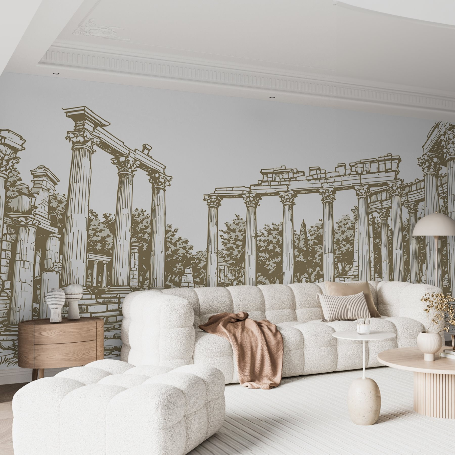 Proměňte svůj prostor pomocí této úchvatné nástěnné malby s úžasnou kamennou strukturou zdobenou majestátními sloupy. Představte si, že vstoupíte do místnosti, kde dávná historie šeptá příběhy o vznešenosti. Díky složitým detailům si budete připadat, jako byste vstoupili do venkovní galerie, která zve k hřejivému slunečnímu světlu a čerstvému vánku. Představte si, jak popíjíte kávu a vychutnáváte si klid, který tato nástěnná malba přináší. Vytváří uvolněnou atmosféru, ideální pro líná odpoledne nebo živá setkání. Navíc vyvolává konverzaci – kdo by si nechtěl povídat o takovém jedinečném prvku ve svém domově?