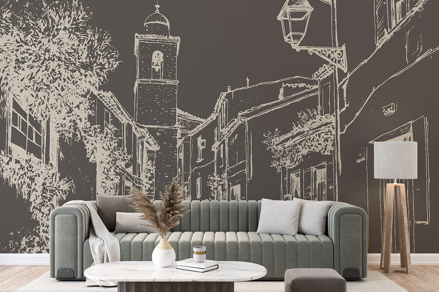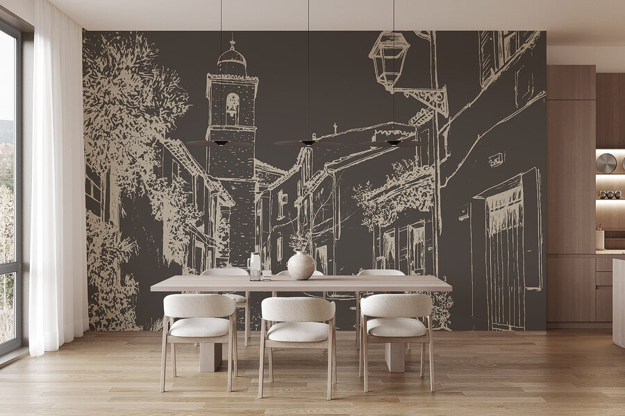 Vstupte do okouzlující pouliční scény s touto nástěnnou malbou, která zachycuje teplo útulného vesnického života. Se svými malebnými budovami a zvonicí, která vypadá jako z pohádkové knihy, je ideální pro rozproudění snění a toulek. Představte si, že popíjíte kávu při pohledu na tento krásný výhled, jako by se hned za nástěnnou malbou linula vůně čerstvého chleba. Jemná práce s linkami přináší hravý nádech a vybízí k pocitu klidu. Tato nástěnná malba se skvěle hodí do každé místnosti a dodá jí charakter a ty krásné malé okamžiky, které dělají domov domovem. Je také skutečným začátkem konverzace – kdo by si nechtěl povídat o svých imaginárních cestách?