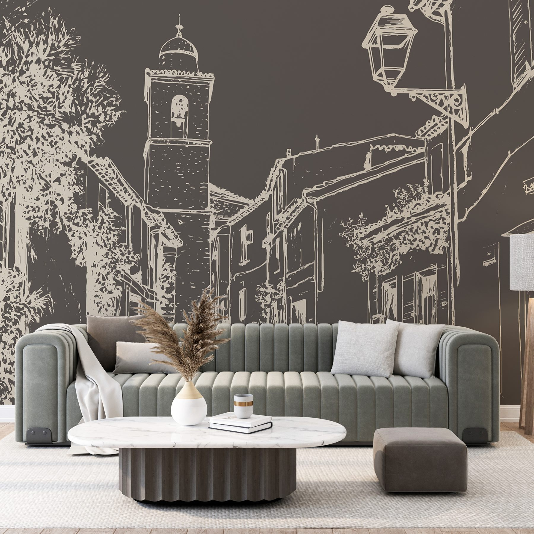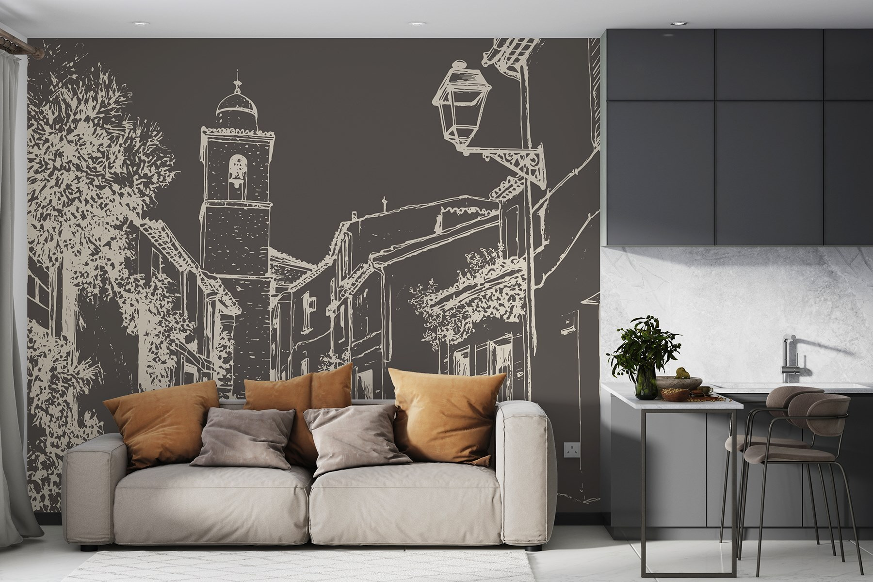 Vstupte do okouzlující pouliční scény s touto nástěnnou malbou, která zachycuje teplo útulného vesnického života. Se svými malebnými budovami a zvonicí, která vypadá jako z pohádkové knihy, je ideální pro rozproudění snění a toulek. Představte si, že popíjíte kávu při pohledu na tento krásný výhled, jako by se hned za nástěnnou malbou linula vůně čerstvého chleba. Jemná práce s linkami přináší hravý nádech a vybízí k pocitu klidu. Tato nástěnná malba se skvěle hodí do každé místnosti a dodá jí charakter a ty krásné malé okamžiky, které dělají domov domovem. Je také skutečným začátkem konverzace – kdo by si nechtěl povídat o svých imaginárních cestách?