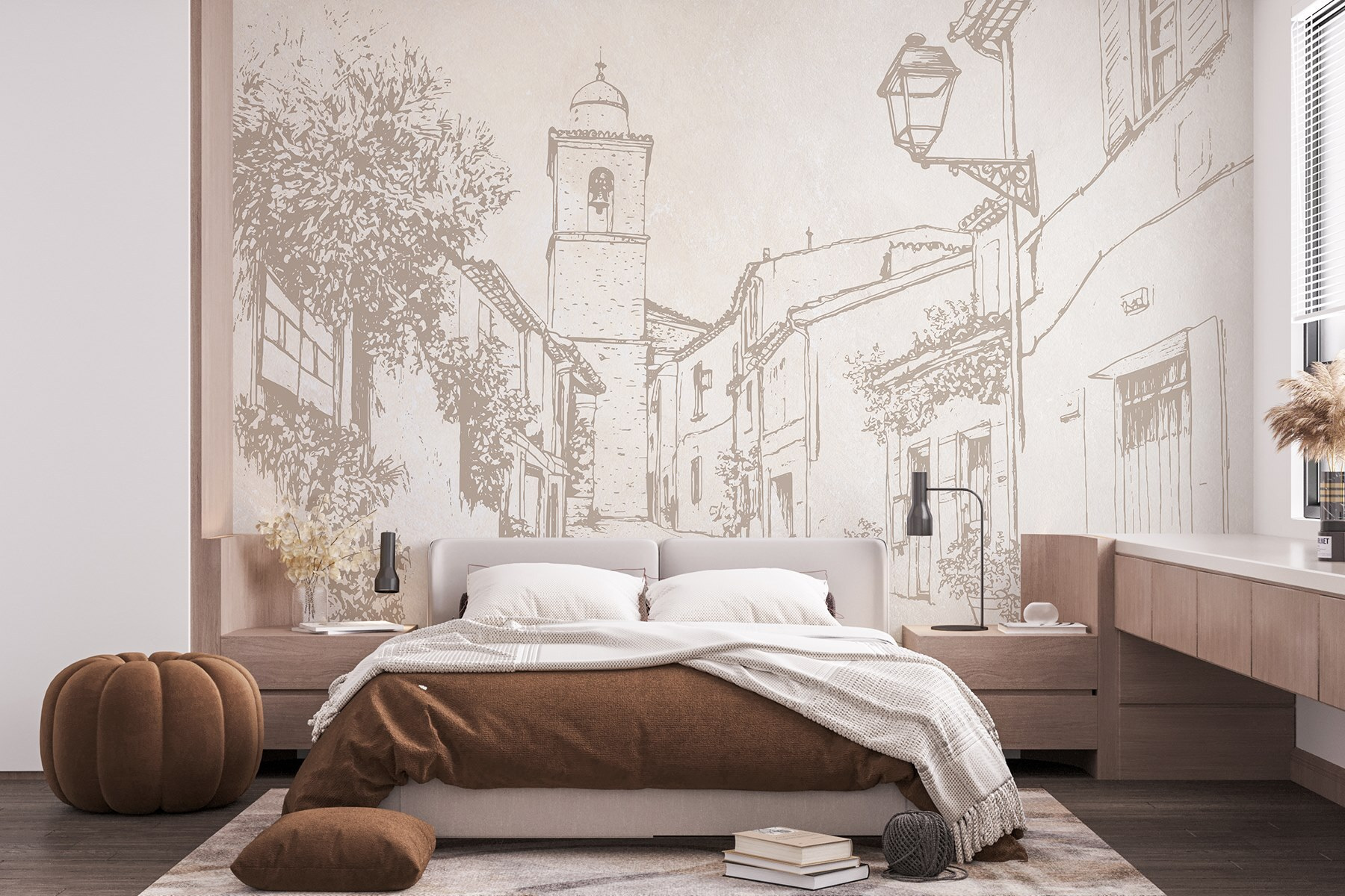 Proměňte každou místnost v okouzlující únik s touto nástěnnou malbou, která zobrazuje malebnou pouliční scénu se zvonicí. Představte si, že jdete po dlážděné cestě a vzduchem se line vůně čerstvého pečiva. Tato nástěnná malba vás vybízí ke snění o sluncem prozářených odpoledních hodinách a přátelských sousedech. Rozmarné linie a jemné odstíny vytvářejí uklidňující atmosféru, která se skvěle hodí do obývacího prostoru nebo útulného zákoutí. Je to jako mít kousek evropské vesnice přímo u vás doma – ideální pro rozproudění rozhovorů plných toulek u kávy.