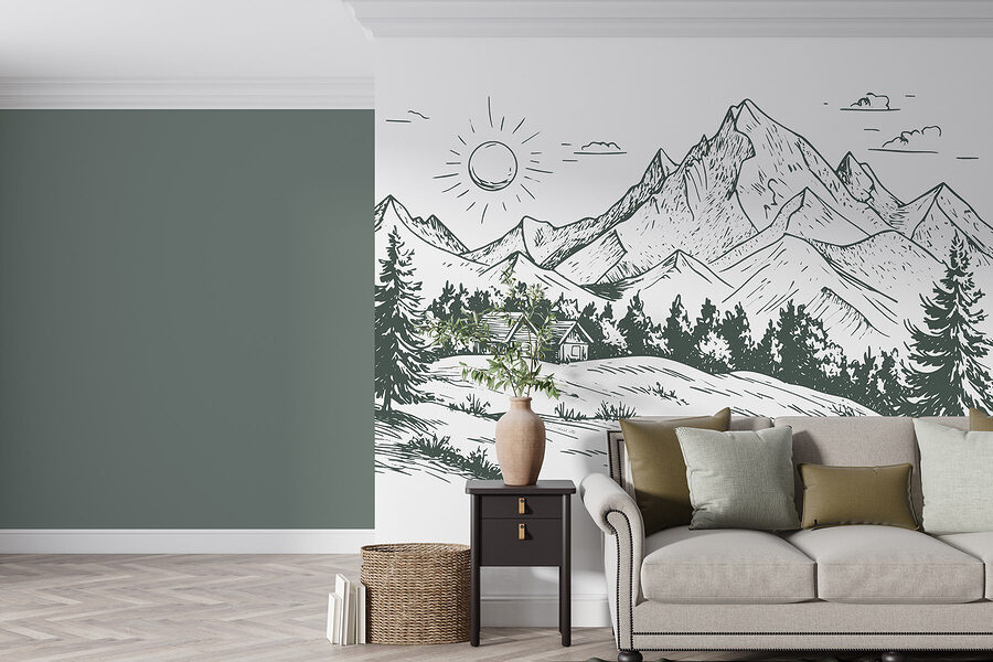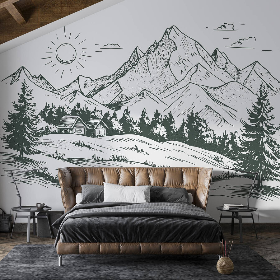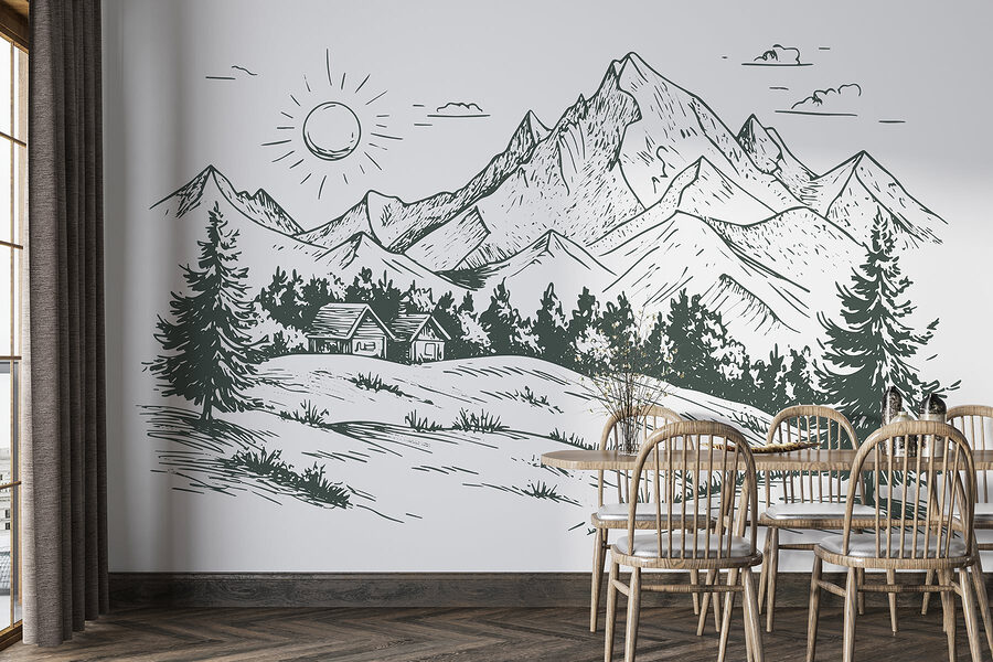 Proměňte prázdnou stěnu v klidné útočiště pomocí této podmanivé nástěnné malby s půvabným domem zasazeným mezi velkolepé hory a svěží stromy. Představte si, že se probouzíte s jemnou připomínkou krásy přírody přímo ve svém obývacím pokoji nebo domácí kanceláři. Ostré linie a zemité tóny vytvářejí klidnou atmosféru, která je ideální pro odpočinek po dlouhém dni. Je to jako přenést kousek venkovní přírody dovnitř, bez komárů. Ať už se jedná o útulný čtecí koutek, nebo o příjemné místo pro přátele, tato nástěnná malba navodí tu správnou náladu. Kdo by se nechtěl ve svém každodenním životě cítit trochu víc zenově?