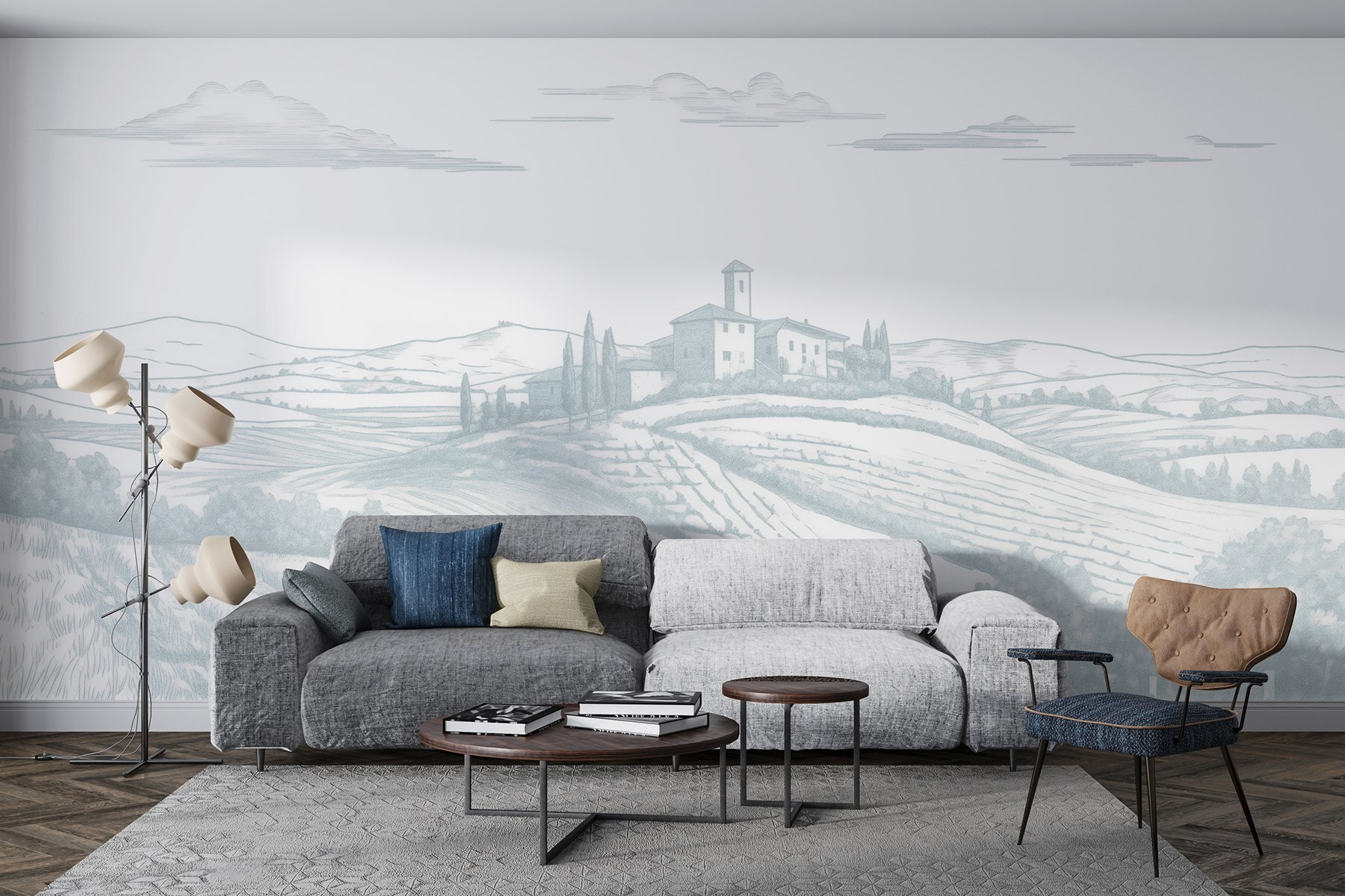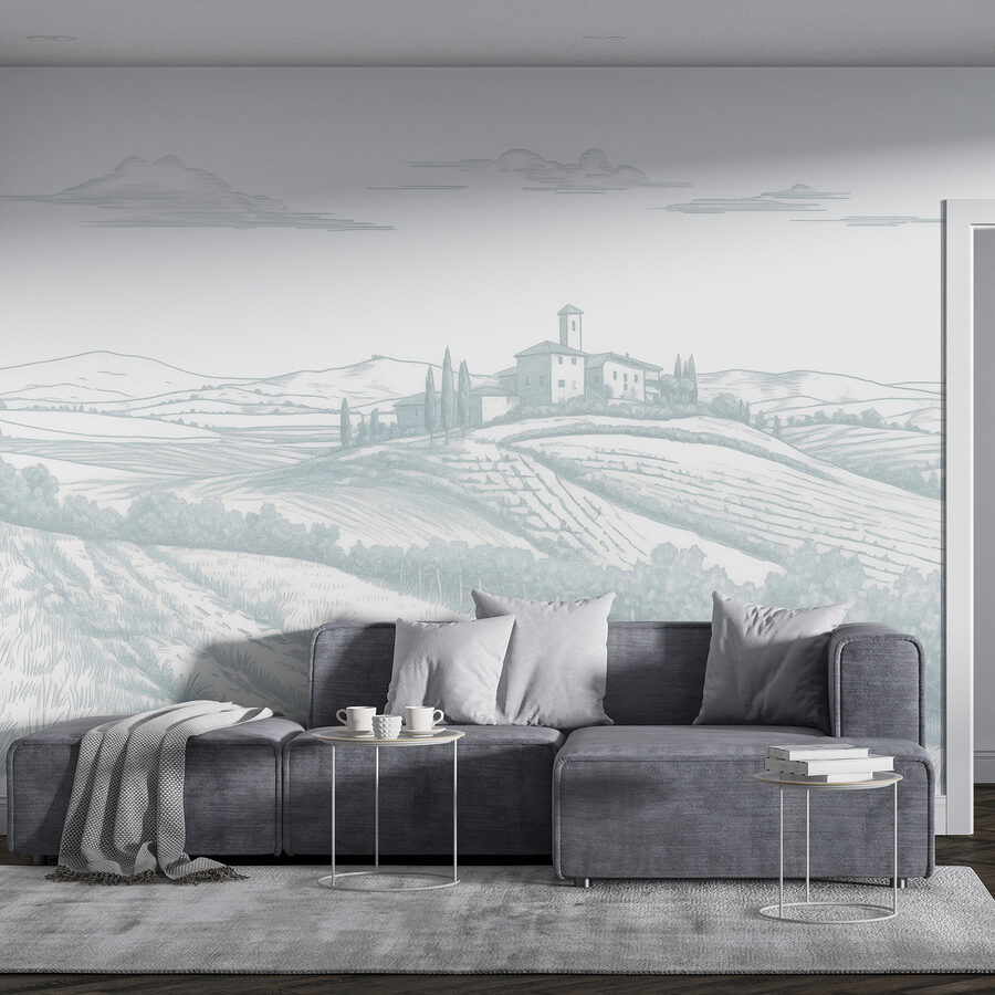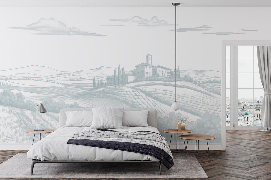 Proměňte jakýkoli prostor pomocí této úchvatné nástěnné malby s klidnou krajinou posetou půvabným domem a půvabnými stromy. Představte si, že vejdete do místnosti a okamžitě se přenesete na mírné kopce a sluncem ozářené louky. Jemné obrysy navozují pocit klidu, takže se skvěle hodí do útulného čtecího koutku nebo i do živého pracovního prostoru. Představte si, jak popíjíte kávu, díváte se na svůj nový výhled a vdechujete klid. Je to jako mít mini útěk přímo u vás doma! Tato nástěnná malba nejen zdobí, ale vytváří atmosféru, která našeptává relaxaci.
