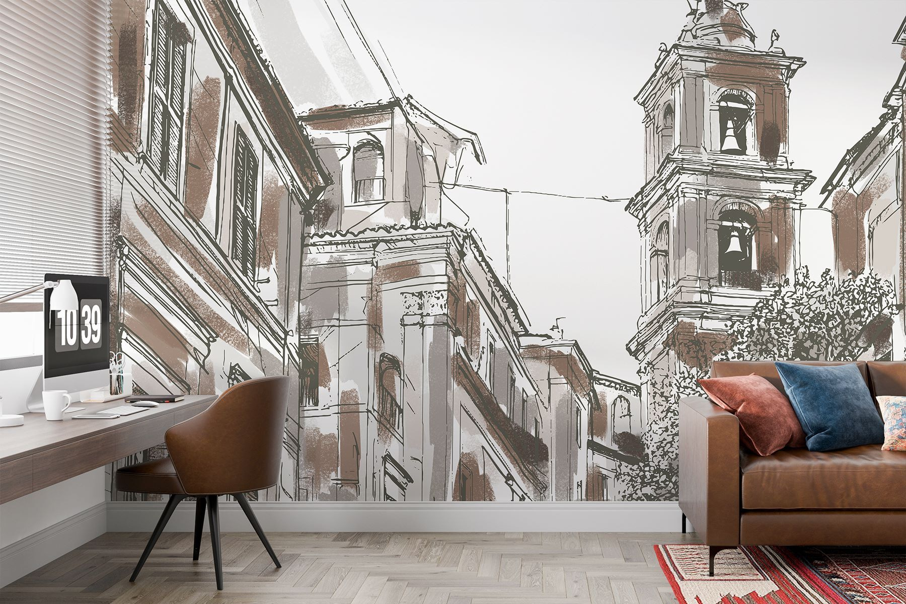 Proměňte svůj prostor pomocí této úžasné nástěnné malby s krásně nakreslenou budovou doplněnou okouzlujícími zvonky. Představte si, jak odpočíváte v útulném koutě, dovnitř proudí sluneční světlo a tato nástěnná malba přináší dotek architektonické historie přímo na vaše stěny. Je to jako jemný šepot minulosti, kde každý pohled vybízí ke snění o vzdálených místech. Jemné odstíny vytvářejí hřejivou atmosféru, takže se skvěle hodí do obývacího pokoje nebo klidného čtecího koutku. Kdo by se nechtěl nechat unést nástěnnou malbou, která působí jako umělecký únik?