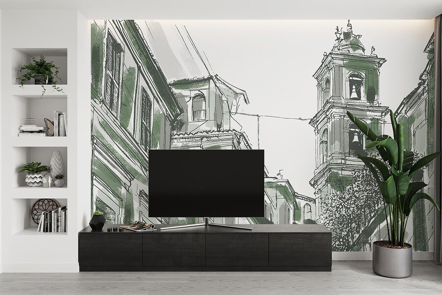S touto okouzlující nástěnnou malbou vnesete do svého prostoru nádech městského šarmu. Představte si ji: podmanivá kresba budovy zdobené zvonky, která šeptá příběhy o rušném městském životě. Jemná zeleň a složité linie vybízejí k nahlédnutí do klidné, ale živé krajiny ulic a podněcují představivost. Představte si, že popíjíte kávu, díváte se na tuto nástěnnou malbu a cítíte, jak vás obklopuje teplo komunity a historie. Ideální do obývacích pokojů, kaváren nebo útulných čtecích koutků, kterým dodá osobitost, aniž by prostor přeplnila. Je to jako mít kousek městského kouzla přímo doma.