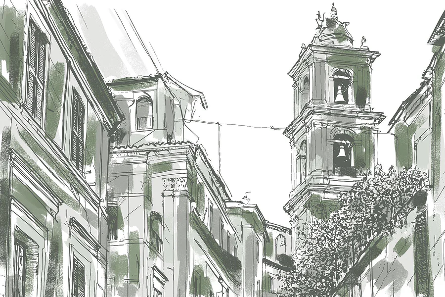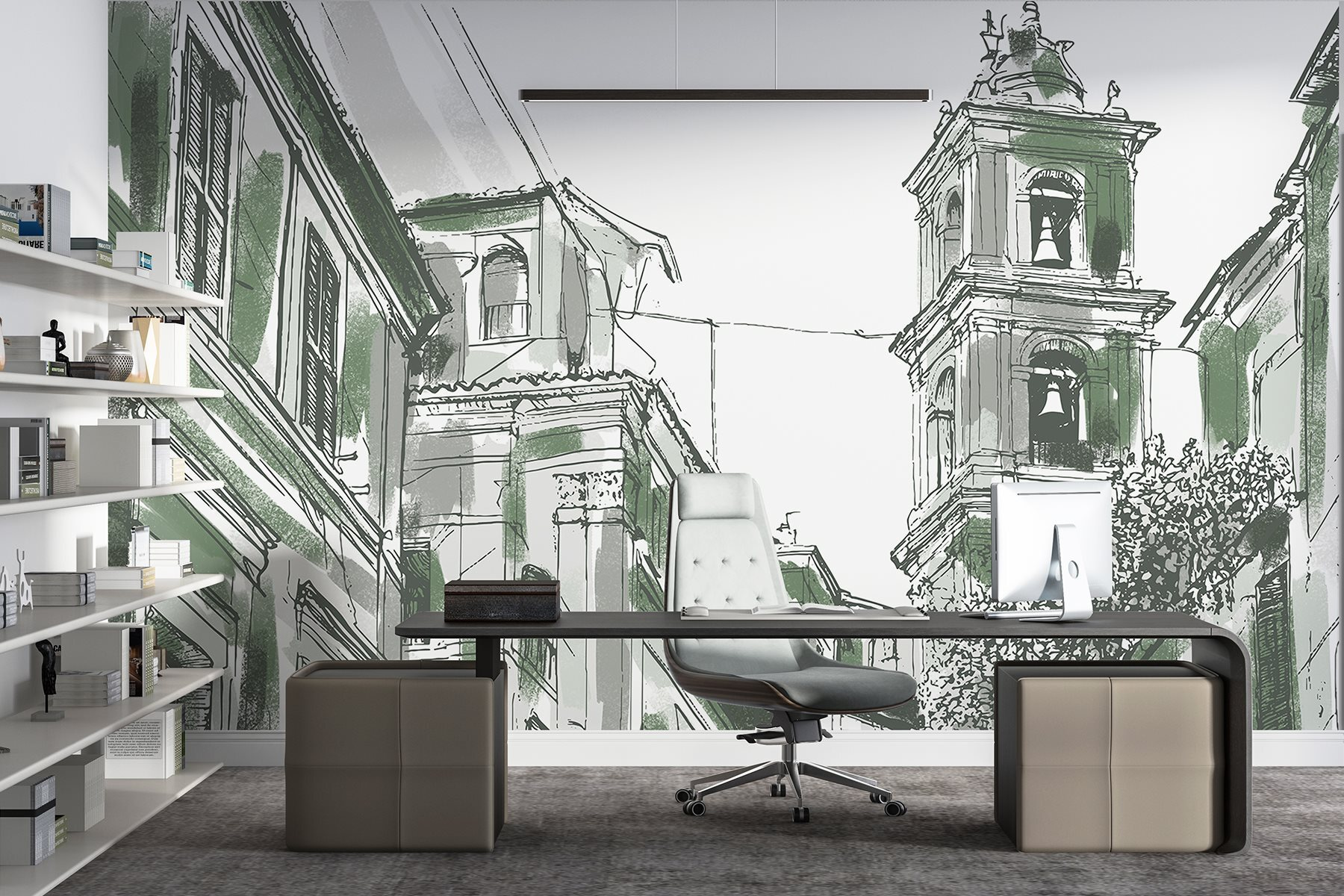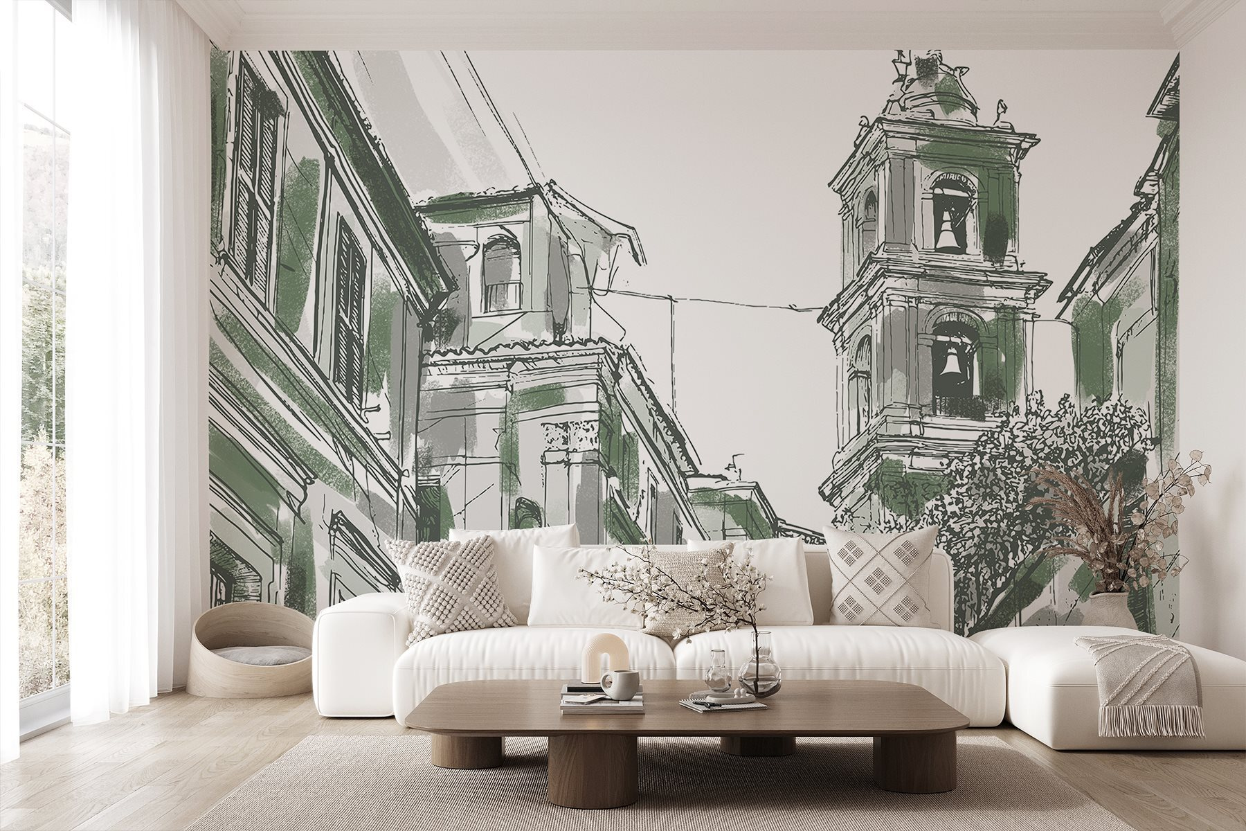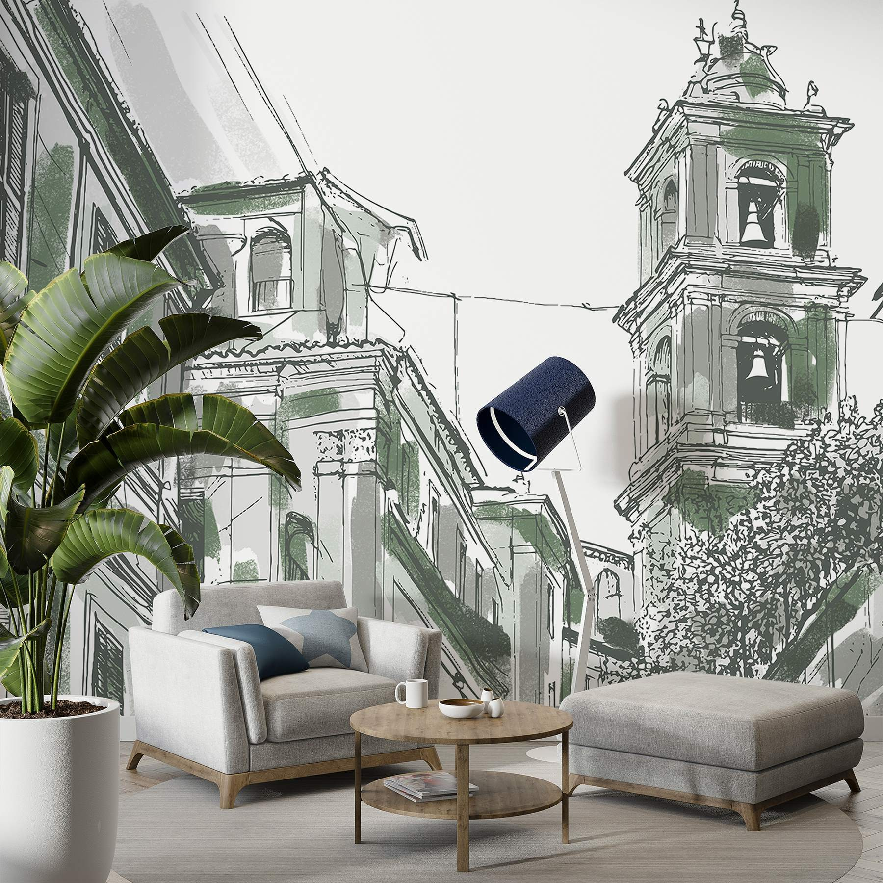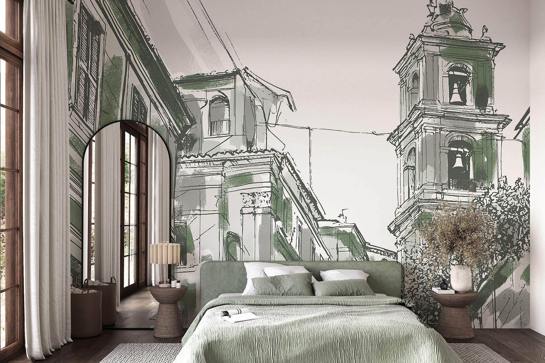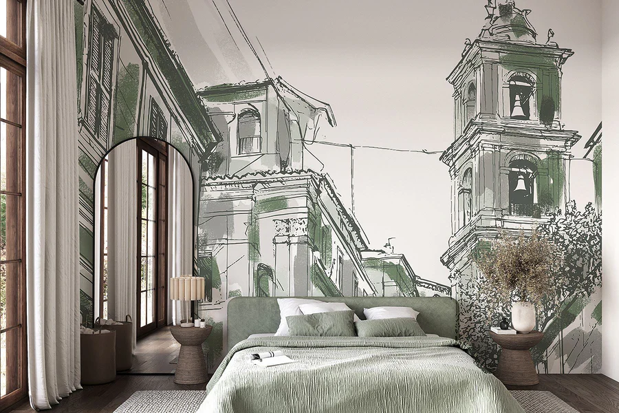 S touto okouzlující nástěnnou malbou vnesete do svého prostoru nádech městského šarmu. Představte si ji: podmanivá kresba budovy zdobené zvonky, která šeptá příběhy o rušném městském životě. Jemná zeleň a složité linie vybízejí k nahlédnutí do klidné, ale živé krajiny ulic a podněcují představivost. Představte si, že popíjíte kávu, díváte se na tuto nástěnnou malbu a cítíte, jak vás obklopuje teplo komunity a historie. Ideální do obývacích pokojů, kaváren nebo útulných čtecích koutků, kterým dodá osobitost, aniž by prostor přeplnila. Je to jako mít kousek městského kouzla přímo doma.