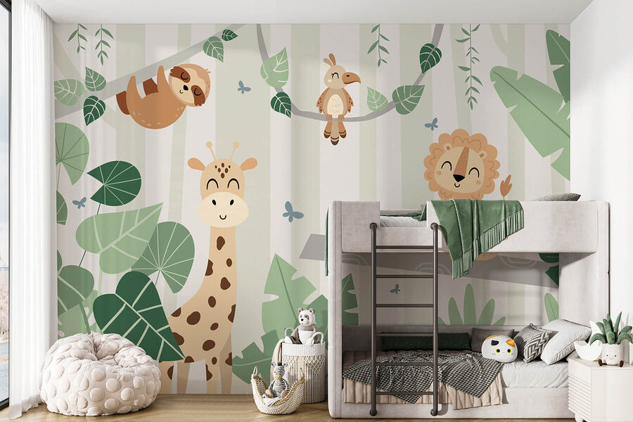 Proměňte jakýkoli prostor pomocí této nádherné nástěnné malby džungle s okouzlujícími zvířecími postavičkami, včetně veselé žirafy, uvolněného lenochoda a hravého lva. Je to jako vstoupit do hravého ráje pokaždé, když vstoupíte do místnosti. Představte si, jak se děti chichotají, zatímco jsou obklopeny svěží zelení a chlupatými kamarády – mohou dokonce předstírat, že jsou průzkumníky na vzrušujícím safari! Každý detail přináší pocit zábavy a úžasu, což je ideální pro rozvíjení představivosti. Tato nástěnná malba nejen rozzáří stěny, ale také vnese bezstarostnou atmosféru do času her, spánku nebo kdykoli jindy. Kdo by nechtěl mít doma své vlastní útočiště v džungli?