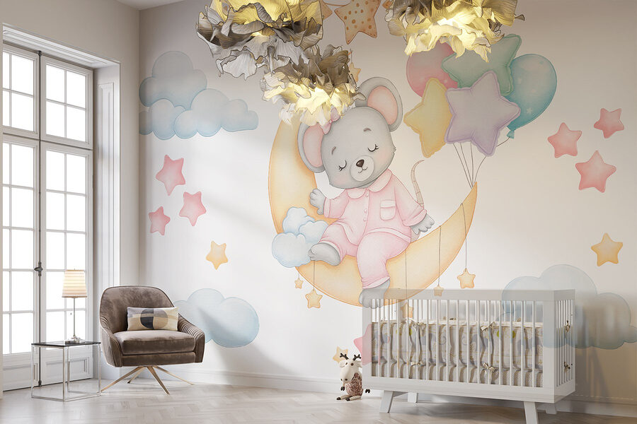 S touto okouzlující fototapetou s myší, která se uvelebila na Měsíci a svírá barevné balónky, proměníte každý pokoj ve snový únik. Představte si jemnou záři osvětlující tyto drobné hvězdičky, zatímco vaše děťátko usíná a sní o rozmarných dobrodružstvích mezi mraky. Je to jako oživlá pohádka na dobrou noc – ideální do dětských pokojů nebo heren! Pastelová paleta vytváří uklidňující atmosféru, takže je snadné představit si všechny ty hihňavé a sladké sny, které může tato okouzlující scéna inspirovat. Přidejte na stěny kapku magie a nechte se unášet fantazií!