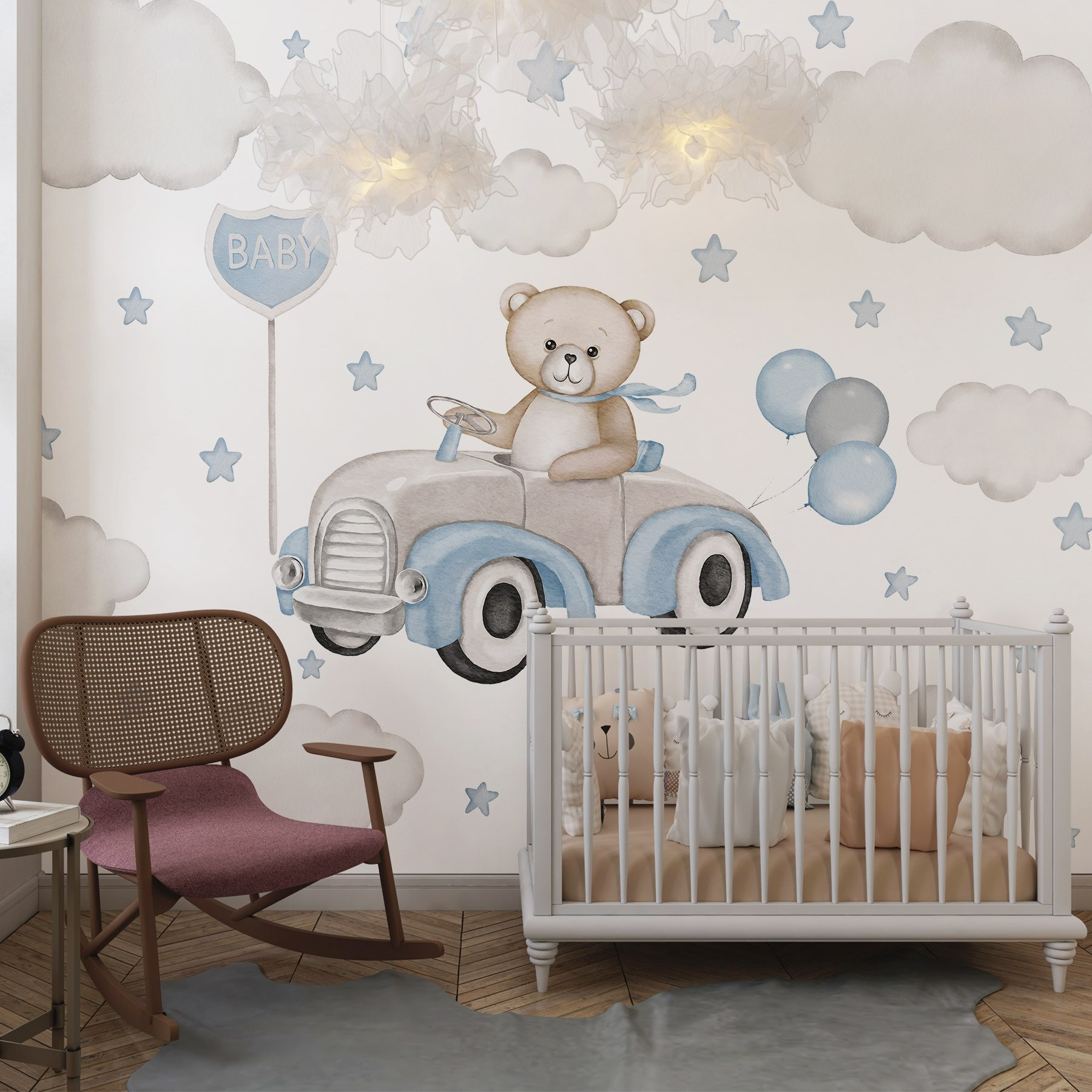 Proměňte dětský prostor v dobrodružství s touto okouzlující nástěnnou malbou s medvídkem, který se veze v roztomilém autíčku a svírá barevné balónky. Je to jako malá pohádková scéna přímo na zdi! Představte si radost na tváři vašeho děťátka pokaždé, když vstoupí do pokoje. Hravé barvy a rozmarný design vytvářejí dokonalou náladu pro velké sny. Navíc nadýchané obláčky a třpytivé hvězdičky dodávají kouzelný nádech. Není to jen dekorace, je to výzva k radostnému snění a bezbřehé fantazii. Kdo by nechtěl naskočit do tohoto auta a projet se?