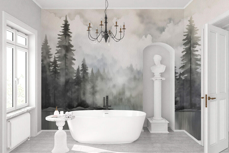 Proměňte jakýkoli prostor pomocí této úžasné akvarelové nástěnné malby lesa a klidného jezera. Představte si, že vejdete do místnosti a máte pocit, že jste vstoupili přímo do náruče přírody. Jemné odstíny šedé a zelené barvy nabízejí uklidňující atmosféru, která je ideální pro vytvoření klidného útočiště ve vašem domově.