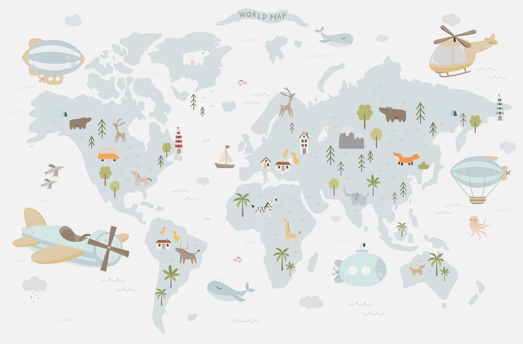 Proměňte svůj prostor díky rozmarnému kouzlu nástěnné malby Mapa světa. Tato rozkošná nástěnná malba vás vezme na cestu napříč kontinenty, aniž byste potřebovali pas. Představte si, jak se dětem rozzáří tváře, když spatří hravá zvířátka, plachetnice, a dokonce i horkovzdušné balóny rozeseté po celém světě. Je to jako mini dobrodružství přímo na vaší zdi! Tato nástěnná malba není jen hezká – je to podnět ke konverzaci, která vyvolá sny o vzdálených místech. Perfektně se hodí do dětského pokoje nebo do živého hracího koutku a jistě vykouzlí úsměv na tváři a možná i trochu inspirace pro budoucí objevitele. Kdo by nechtěl snít ve velkém s takovou veselou kulisou?