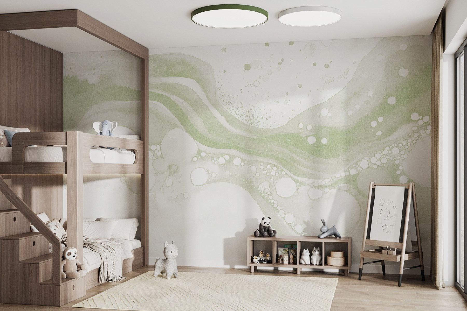 Proměňte svůj prostor pomocí této úžasné akvarelové nástěnné malby, která kombinuje uklidňující zelenou a klidnou bílou. Představte si, že vejdete do místnosti, kde stěny našeptávají relaxaci a kde se budete vyhřívat v jemném proudu barev. Je to jako závan čerstvého vzduchu – ideální pro útulný obývací pokoj nebo ten klidný čtecí koutek. Hosté se nepochybně zastaví, možná se i nakloní, aby obdivovali jemné křivky a hravé tečky. Není to jen nástěnná malba; vyvolává rozhovory a vybízí ke snění. Dopřejte svým stěnám trochu lásky s tímto uklidňujícím uměleckým dílem, které působí jako umělecký únik.