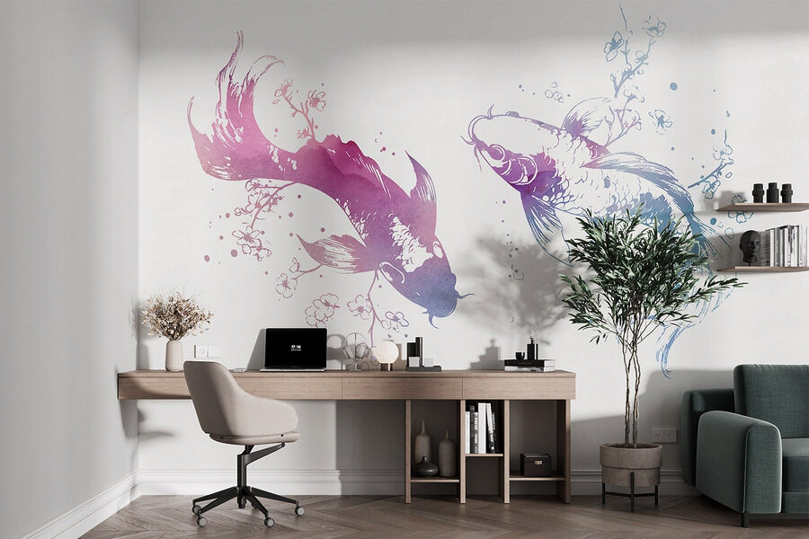 Proměňte svůj prostor pomocí této okouzlující nástěnné malby se dvěma elegantními rybami, které plavou uprostřed akvarelových stříkanců. Je to jako přenést si kousek mořského pobřeží přímo k vám domů, bez písku v botách. Jemné odstíny tančí po celé ploše nástěnné malby a navozují pocit klidu, který snadno rozzáří každou místnost. Představte si, že sedíte v útulném koutku, popíjíte čaj a tyto ladné rybky jako by proplouvaly kolem – možná dokonce zapomenete, že jste v interiéru. Je to okouzlující dotek, který našeptává sofistikovanost a klid, ideální pro vytvoření klidné atmosféry. Nedivte se, když si s rybkami začnete povídat; možná vám budou mít co říct!