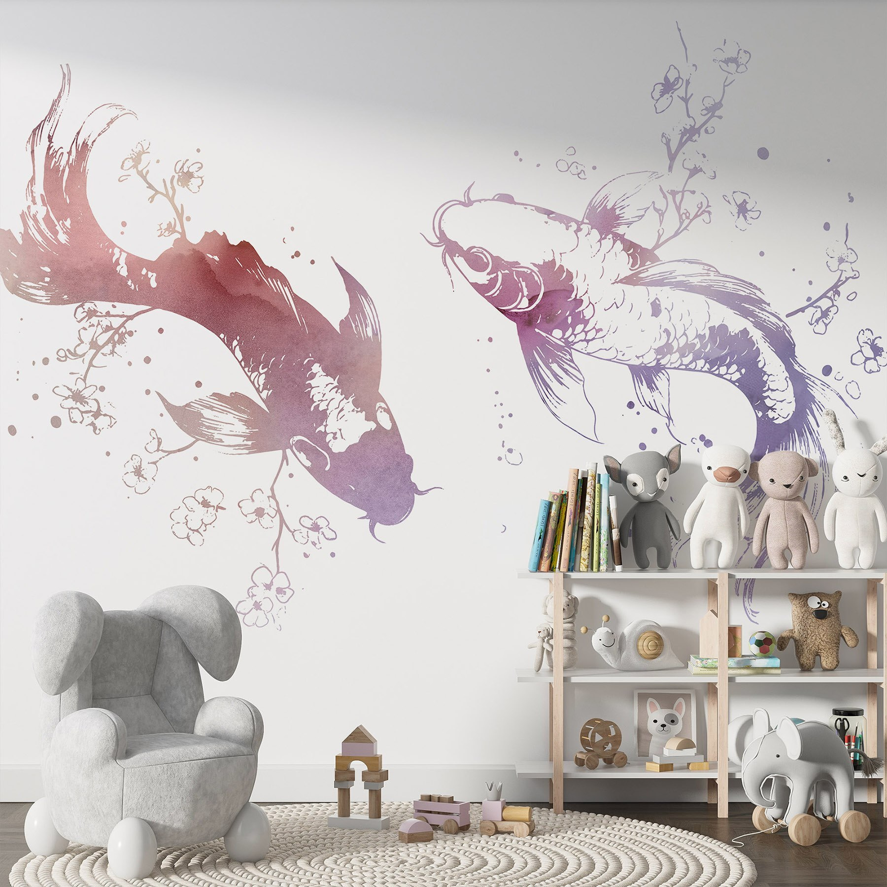 Proměňte svůj prostor ve vodní říši divů s touto okouzlující nástěnnou malbou se dvěma ladnými rybami, které plavou mezi jemnými květy a vířícími listy. Představte si, že vstoupíte do klidného podmořského světa, kde umění tančí na vašich stěnách a navozuje klid a kreativitu. Akvarelový styl této nástěnné malby jí dodává rozmarný nádech, takže se skvěle hodí do útulného čtecího koutku nebo do bezstarostného obývacího prostoru s plážovou tématikou. Představte si, jak popíjíte čaj, zatímco ryby jako by jemně klouzaly kolem a vnášely přírodu přímo do vašeho domova. Je to jako vaše osobní oáza, bez mokrých nohou a mořských řas!