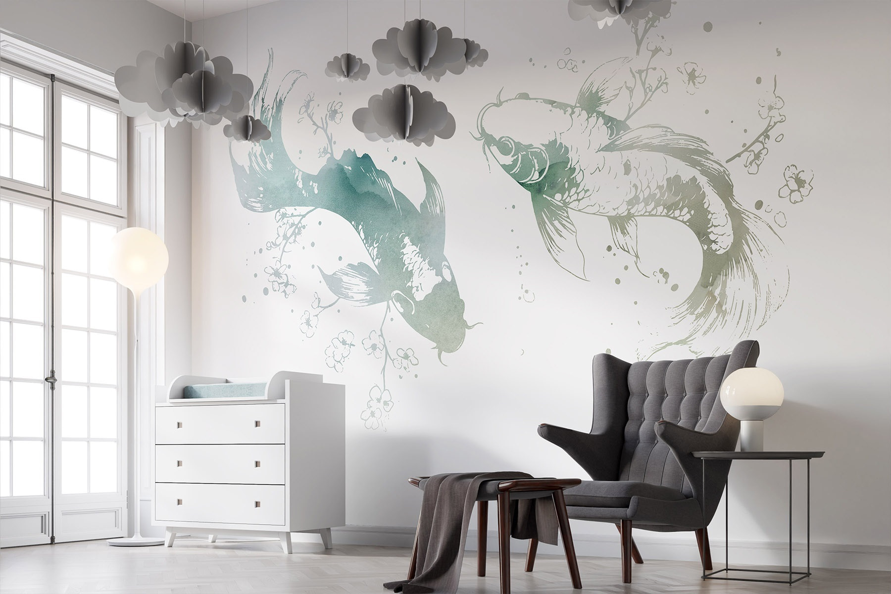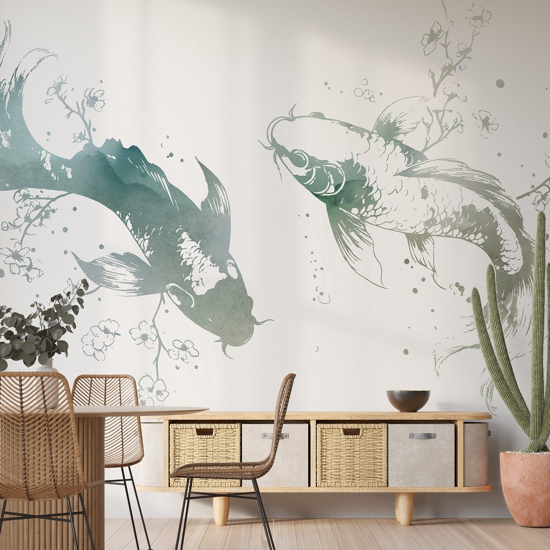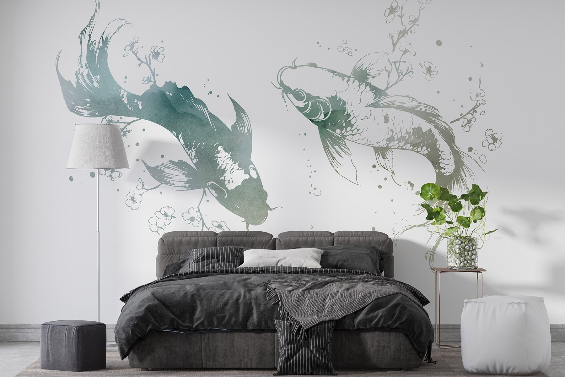 Proměňte svůj prostor v klidné útočiště díky této podmanivé nástěnné malbě se dvěma půvabnými rybami obklopenými jemnými květy a listy. Představte si, že vejdete do místnosti a ony tam kloužou po jemných akvarelech, které vdechnou vašim stěnám život. Je to jako mít doma malý kousek přírody, který s každým pohledem navozuje pocit klidu.