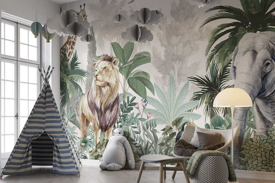 Proměňte svůj prostor v zázračnou říši divoké zvěře díky této úžasné nástěnné malbě s majestátním lvem, hravými tukany a něžným slonem uprostřed svěží zeleně. Jako byste si přinesli kousek džungle přímo k sobě domů. Představte si, že se pohodlně usadíte, necháte se unášet zářivými barvami a zažijete pocit klidu, když se na vašich stěnách bude dařit přírodě. Tato nástěnná malba je ideální do každého pokoje, který touží po troše dobrodružství, a vybízí k odpočinku a objevování. Kdo by to byl řekl, že se při zdobení můžete cítit jako na mini safari? Každý pohled může vyvolat radost a proměnit obyčejné dny v neobyčejné okamžiky. Je to ten druh nástěnného umění, který vám vykouzlí úsměv na tváři a přenese divočinu přímo do vašeho útulného koutku.