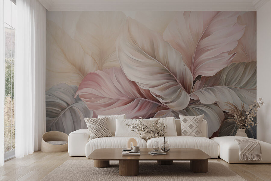 Proměňte svůj prostor pomocí této úžasné nástěnné malby: “Jemné odstíny přírody se krásně prolínají.” Představte si to hned – svěží listy v jemně růžové a měkké šedé barvě, které zahalí vaše stěny do něžného objetí. Je to jako přenést do interiéru klidnou zahradu, která zve ke klidu a teplu do každého koutu.
