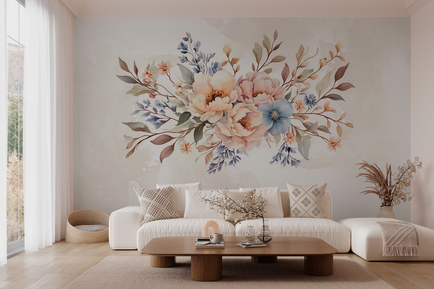 Proměňte svůj prostor pomocí této úžasné nástěnné malby s kyticí květin na jemném bílém pozadí. Je to jako mít zahradu přímo ve svém obývacím pokoji – bez nutnosti údržby. Představte si, že vejdete do místnosti a přivítají vás křehké pivoňky a jemné odstíny, které vám zvednou náladu. Tato nástěnná malba jiskří radostí a vybízí k vřelosti a vytváří dokonalé pozadí pro útulná setkání nebo klidné chvíle s knihou. Navíc je to snadný způsob, jak přidat barevný nádech, aniž byste museli počítat s živými rostlinami. Je to květinové kouzlo, přesně tam, kde ho potřebujete!